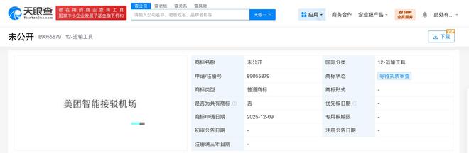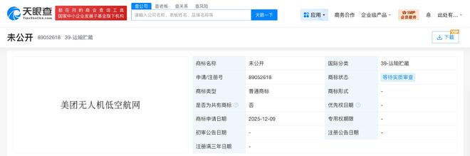 雷达财经讯,天眼查知识产权信息显示,近日,美团关联公司北京三快科技有限公司申请注册多枚“美团智能接驳机场”“美团无人机玄武云”“美团无人机云枢”“美团无人机低空航网”等商标,国际分类包括运输工具、运输贮藏等,当前商标状态均为等待实质审查。