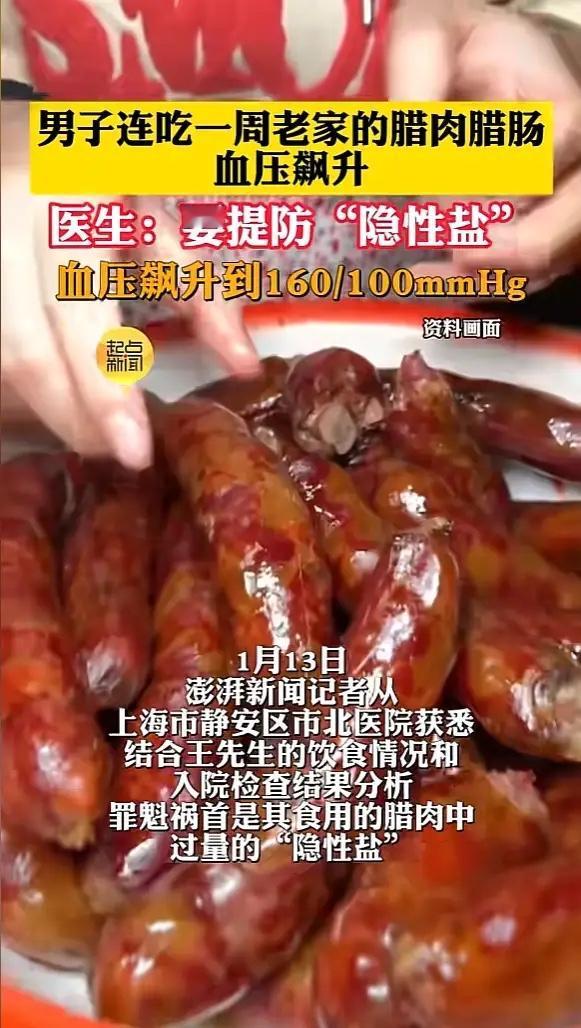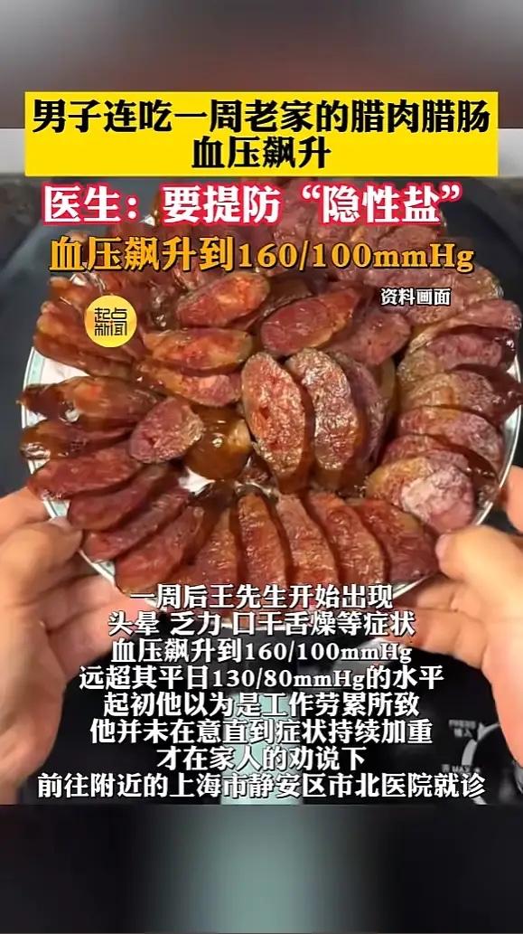 “悲剧还是发生了!”近日,上海,一男子收到老家的腊肉后,每顿饭都要吃上几口,结果过了一周,男子开始头晕乏力,口干舌燥,去医院检查后,才发现血压已经飙升,远超正常水平,而罪魁祸首,就是他每顿吃的腊肉!网友:爱吃腊肉的我哭了! 王先生收到老家亲友寄来的一大箱腊肉,那份浓缩着乡情和年味的“家乡味道”,让他爱不释口,几乎顿顿饭桌都少不了它的身影。谁能想到,短短一周竟让他的血压猛飙至160/100mmHg的危险高位,远超出其平日130/80mmHg的水平。 为了保鲜和形成独特风味,腊肉在制作过程中会加入大量食盐,王先生连续食用,相当于在不知不觉中摄入了远超日常所需的钠。过量的钠进入身体,会引发“水钠潴留”,简单说就是身体里的水分变多了,直接导致血容量增加,心脏负担加重,血压也就跟着急剧升高,这是“高盐饮食引发的急性血压升高”。 冬季人们活动量减少了很多,这时候身体的新陈代谢放慢了很多,如果此时大量摄入高盐高脂的食物,就会对身体造成很大的负担。腊肉这类传统风味,每次食用量最好控制在100克以内(大约2-3片),不要像王先生这样控制不住嘴。 做腊肉可以先用水煮或蒸一下,这个步骤可以去除一部分盐分和油脂,吃的时候可以多搭配新鲜蔬菜和水果。这样蔬菜水果中的钾元素,可以促进体内多余的钠排出。 有高血压、高血脂等基础疾病的朋友,享受腊肉美味的时候更需要格外谨慎,最好能咨询医生,听听医生的建议。享受传统美味固然是生活的乐趣,但身体健康才是享受一切的前提。 各位读者你们怎么看?欢迎在评论区讨论。