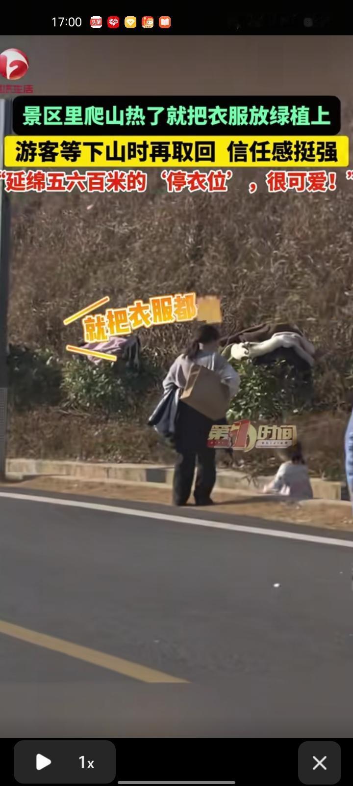 1月10日,江西南昌。网友晒视频表示,蟠龙峰景区温度较高,早晚温差比较大,人们上山就把衣服放在绿植上,连绵五六百米,等下山后再取回。当时觉得挺可爱的,大家的信任感超强。