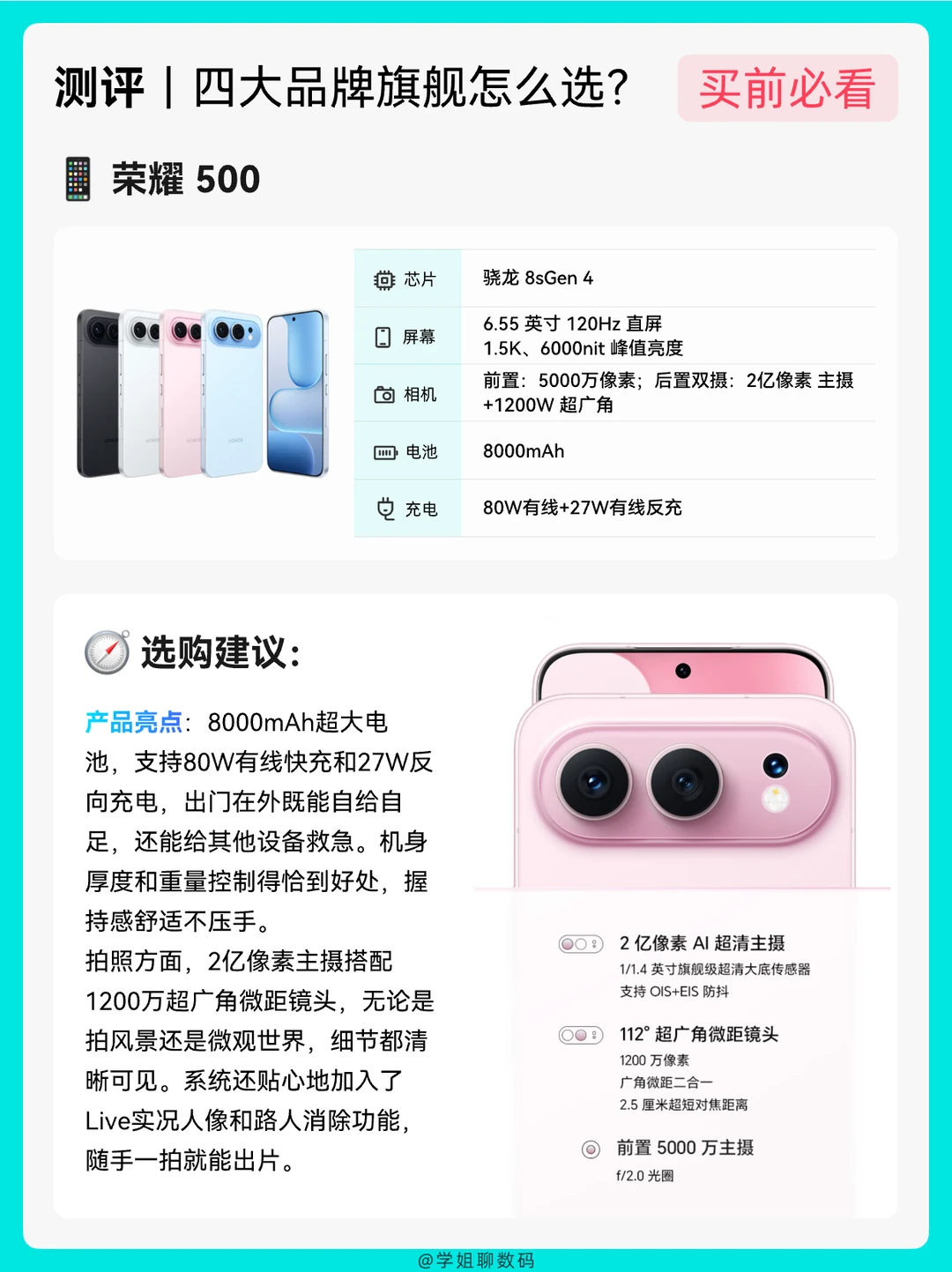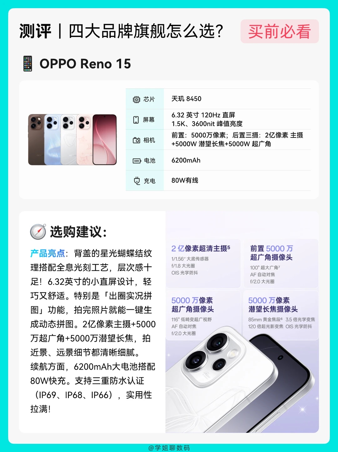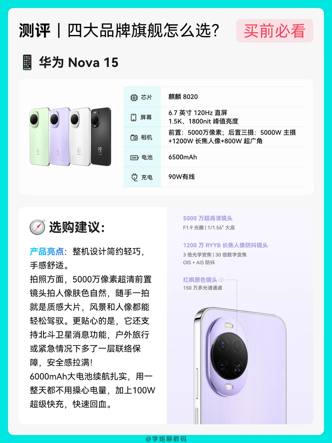 📆2026开始,很多姐妹问学姐华为Nova 15、OPPO Reno15、vivo S50、荣耀500,这四款拍照好看、颜值高的手机怎么选?今天学姐给宝子测评一波配置和体验,不做拉踩,只说区别,宝子们可以参考看下哪款手机更适合你?