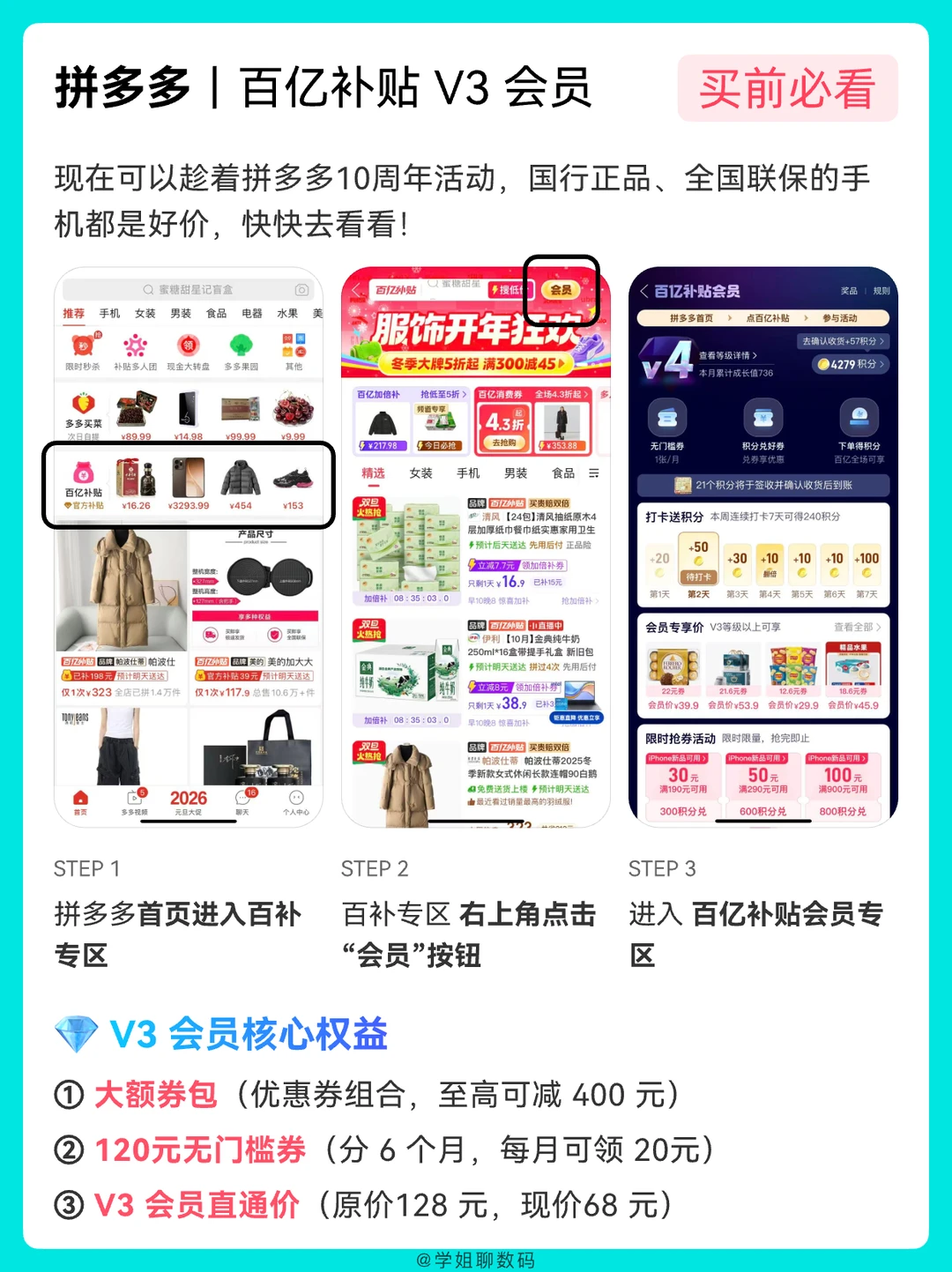目前百亿补贴活动还在进行中,以上几款热门拍照手机都有参与优惠,其他机型也都是冰点价,另外学姐在pdd上买了这么多,有一些我的省钱心得,建议大家多去关注百亿补贴进来的加倍补活动,超多好物翻倍补贴,甚至5折拿下,可以提前在预告中收藏住心仪商品,方便抢购,还有砍价卡和抽抽乐都非常实用,能便宜很多买到自己想要的数码好物。还有右上角的百亿补贴会员,里面会员专享价特别香,不过要升级到V3会员哦,会针对各类商品发平台券,还有不定时出现的v3会员大额券,一单回本,属于是在百亿补贴优惠的基础上折上折了!有计划换新手机的宝子快冲呀,早买早享受~