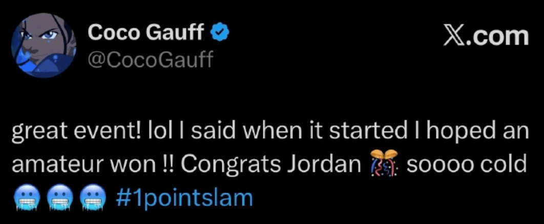 “精彩的赛事!比赛开始时,我就说我希望业余球员夺冠!恭喜乔丹,这太酷了。”