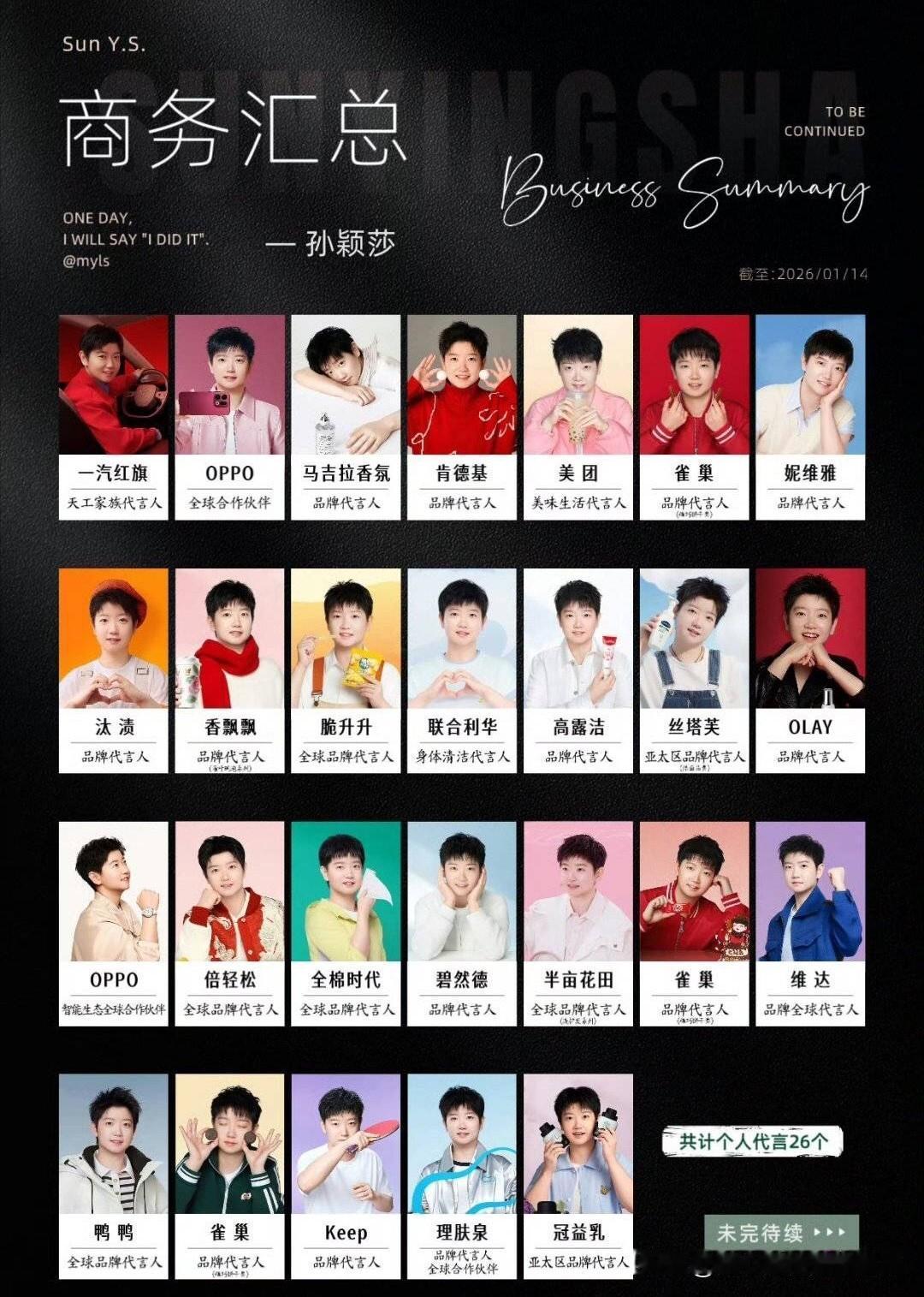 孙颖莎一 26个代言, 顶级运动员, 顶级实力, 顶级商业价值, 孙颖莎她值得! 那些担心她代言太多, 会影响训练的人就不要焦虑了, 商业活动又不是参加综艺节目, 花不了多长时间的, 品牌真心实意喜欢她代言, 球迷们真金白银购买她代言的产品, 双向奔赴、多方共赢、 共同开心、就圆满啦!