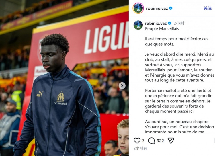 首先,我要说声谢谢。感谢俱乐部、工作人员、我的队友,尤其要感谢你们——马赛的球迷们,感谢你们在这段旅程中给予我的爱、支持和鼓励。