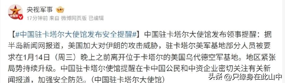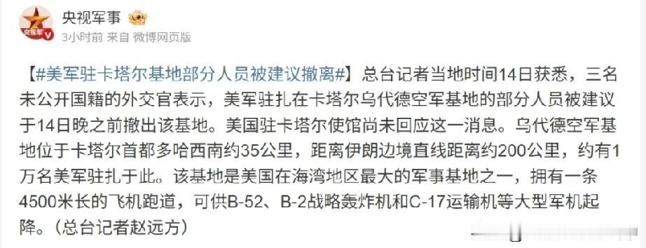 对峙到了节骨眼,大战或许不可避免.. 老美在卡塔尔的乌代德空军基地,离伊朗边境才200公里,突然让部分人员14号晚上前撤离,这操作哪像没事的样子?再加上美方之前放话要针对伊朗,一周内很可能有大动作。 以色列总理的专机同一天降落在希腊,虽说嘴上说是例行训练,但往前翻翻,每次和美伊局势紧张的时候都有类似操作。 真要是撸起来,美方肯定先下狠手,用F35战机敲掉伊朗的雷达和防空系统,再对着石油出口设施这些关键目标猛打,估计会照搬之前在委内瑞拉的打法。 老中也已经发了安全提醒,这也能看出当前局势有多紧张。