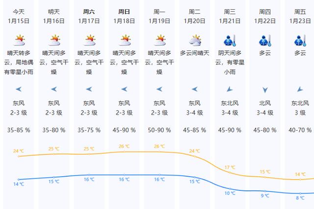 16-20日我市仍以晴天干燥天气为主,湿度有所回升,天气渐转温暖,最高气温25℃左右,早晚有轻雾或轻微灰霾;展望21日起受冷空气影响,气温将明显下降。