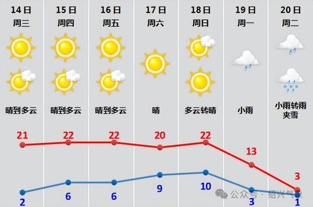 今日绍兴晴到多云,偏南风轻柔送爽,天气整体适宜出行。气温上演“大反转”,今晨最低气温仅2℃左右,寒意未散,早间出门仍需裹紧外套;午后最高温冲上22℃,暖阳之下仿佛提前邂逅春日,不管是户外散步还是晾晒衣被都刚刚好。