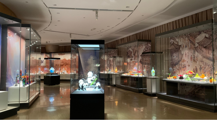淄博博山作为“中国琉璃之乡”,琉璃烧制技艺传承三千年,从明清宫廷贡品到如今的非遗瑰宝,马牙石等天然原料在1200摄氏度高温中经吹、拉、转、压等精湛技法淬炼,终成“类玉”之美。本次展览精选223件(套)琉璃精品,既有承载传统文化的中国生肖、八骏图、蹴鞠八式,也有复刻人间烟火的淄博烧烤、博山盛宴,更有充满巧思的琉璃人脸摆件、动物造型,将自然万物、民俗风情与生活场景尽数熔于琉璃之中,完美诠释“笼天地于形内,熔万物于一心”的艺术哲思。