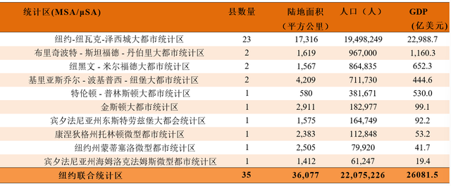 纽约联合统计区(NewYork-Newark,NY-NJ-CT-PACSA)是美国人口最多的联合统计区,2024年人口约为2200万人。纽约联合统计区包含纽约大都市区在内的7个大都市区,以及3个微型都市区,共35个县级行政区(也有说34个县级行政区的,区别在于统计康州是根据规划区还是县),分布在纽约州、新泽西州、康涅狄格州和宾夕法尼亚州四个州内。纽约联合统计区2023年GDP约为2.6万亿美元,占美国GDP的12%以上,全美联合统计区中排名首位。纽约大都市区在联合统计区中面积占到一半,人口和GDP比重都在90%左右。从表5可见,纽约大都市区是联合统计区中最大的一个都市区,从纽约市的核心区域向外辐射,经济影响力的梯度下降明显,到微型都市区,经济总量已经不足百亿美元。