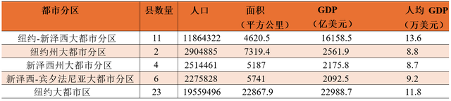首先是纽约-纽瓦克-泽西市大都市统计区(NewYork-Newark-JerseyCity,MSA)。这是我们一般意义上讲的纽约大都市区,也是全美人口和经济总量排名首位的大都市区。纽约大都市区以纽约市的5个县为核,周围有18个县与之经济社会关系密切,形成了该都市区,总面积约2.3万平方公里(含水域面积),总人口1956万,2023年GDP高达2.3万亿美元(已经超过纽约州的经济体量),从面积上看,差不多相当于上海、苏州、无锡和嘉兴四座城市面积之和,但这四座城市的总人口高达5110万,差不多是纽约大都市区的3倍,总GDP是1.47万亿美元,只相当于纽约大都市区的64%。纽约大都市统计区又可以根据地理关系以及人口是否超250万,被分为四个都市分区(详见表4),分别为纽约-新泽西大都市分区(NY-NJMetropolitanDivision)、纽约州大都市分区(NYMetropolitanDivision)、新泽西州大都市分区(NJMetropolitanDivision)和新泽西-宾夕法尼亚大都市分区(NJ-PAMetropolitanDivision)。其中,纽约-新泽西都市分区包含纽约市的五个县和纽约州的其他3个县以及新泽西州的其他3个县,共11个县,总面积4621平方公里,在四个都市分区中最小,而总人口达1186万,四个都市分区中最高,GDP总量也最高,高达16159亿美元。