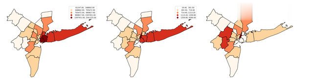 另一组数据,如果我们把这23个县中人口过百万、经济总量过千亿美元的县单独列出来作为“核心县”,除了曼哈顿一骑绝尘外,只有4个县满足条件,分别是布鲁克林所在的国王县、王后区所在的王后县、纽约州的萨福克县(Suffolkcounty,NY)和纽约州的拿骚县(Nassaucounty,NY),更有意思的是,这四个县均在长岛(LongIsland)上(电影《了不起的盖茨比》的取景地)。这5个县的经济总量高达1.47万亿美元,占纽约大都市区GDP的64%,超过纽约市经济总量,这说明纽约大都市区的经济高度集中在曼哈顿及其东部的长岛,这里才是整个区域的核心(如图2前2幅图红色部分)。