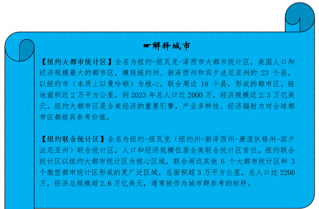 想要知道纽约市的辐射范围有多广,必须了解包含纽约的几个概念,一个是纽约州,美国50个州之一,经济总量50个州排名第3,2024年GDP总量大概2.24万亿美元,仅次于加利福尼亚州和德克萨斯州,如果按照经济体来计算,大约可以排到全球第9位,与意大利的GDP相差无几。纽约市是纽约州的最大城市(但并不是州府,纽约州的州府在奥尔巴尼)。有两个纽约都市区一直备受关注,也是上海大都市圈等国内一众都市区(圈)和城市群对标的重要样本。