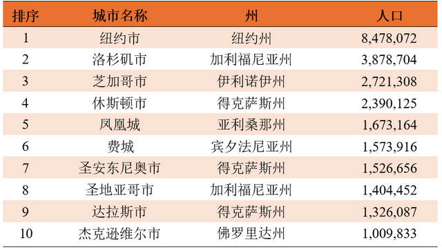 表1截至2024年7月美国人口最多的10座城市