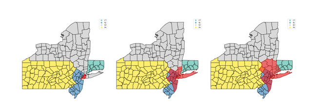 图3纽约市及其大都市区划分示意图,从左向右红色部分分别是纽约市、纽约大都市统计区、纽约联合统计区