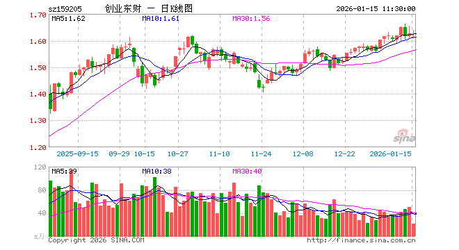 1月15日,截止午间收盘,创业板ETF东财(159205)跌0.80%,报1.614元,成交额3439.88万元。创业板ETF东财(159205)重仓股方面,宁德时代截止午盘涨0.01%,中际旭创跌1.07%,东方财富跌2.87%,新易盛跌1.51%,阳光电源跌1.59%,胜宏科技跌2.74%,汇川技术涨2.53%,迈瑞医疗跌1.89%,亿纬锂能涨0.91%,温氏股份跌0.12%。