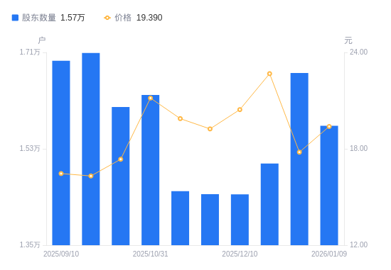日期A股户数(户)流通A股户均持股数(股)户均持股市值(万元)2026-01-091573010878.0121.092025-12-311671610236.3718.212025-12-191502411389.1825.832025-12-101445111840.7824.202025-11-281445411838.3222.782025-11-201450911793.4523.452025-10-311630510494.4022.212025-09-301608010641.2418.462025-09-191709110011.7716.332025-09-101694410098.6316.62