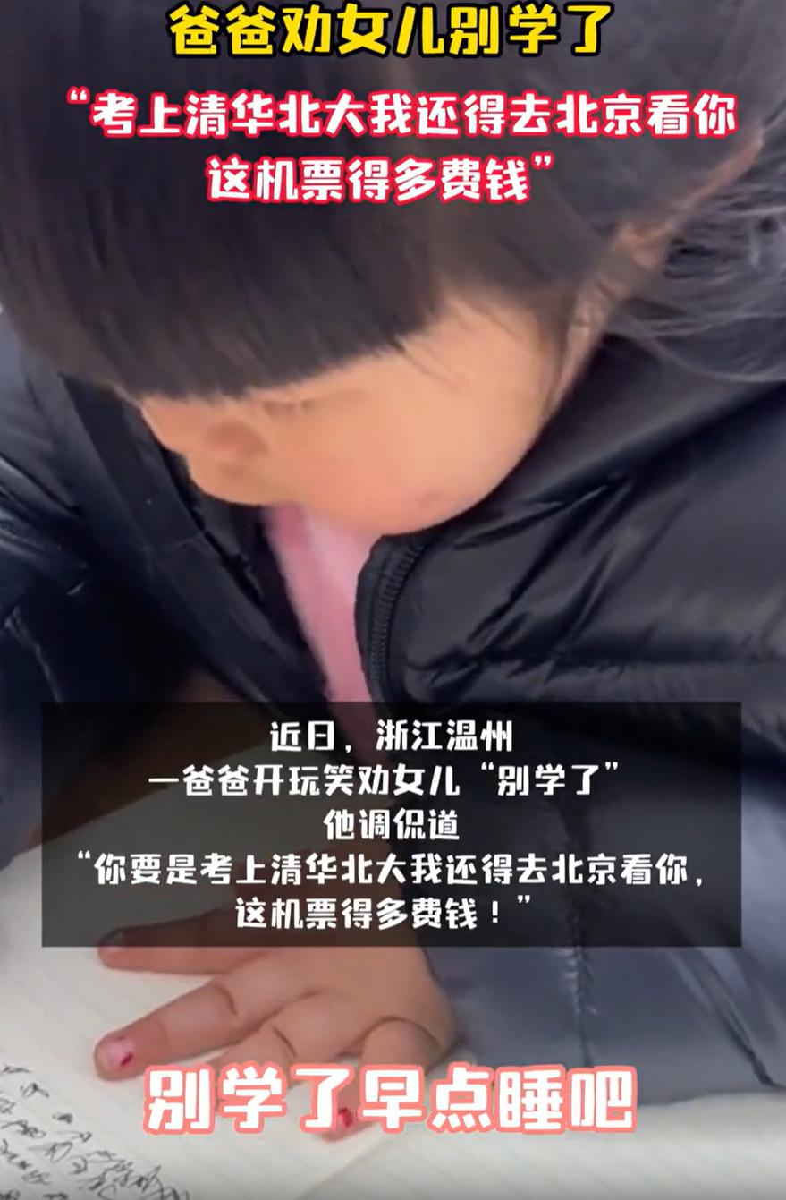 笑死了!浙江温州,一位爸爸看到小学的女儿晚上孩子学习,就想让她早点去睡觉休息,可说了两句没效果,爸爸就来了一波反讽操作:你要是考上北大清华了我还得去北京看你,这机票多贵啊!网友:看孩子这字,真能如你所愿 当时,爸爸推开女儿房间的门,本以为孩子该睡了,没想到书桌上的台灯还亮着。小学女儿趴在桌前,手里握着笔,看起来像在认真学习。可走近一看,纸上密密麻麻的字,写得歪歪扭扭,仔细看甚至认不出是什么内容,明显是在乱涂乱画 爸爸心里明白,女儿这不是在学习,是在磨时间。于是开口劝她早点休息,说多了怕孩子烦,干脆换了个路子,用起了反讽 他半开玩笑地说,你别学了,你要真考上清华,我还得大老远跑北京看你;考上北大,我也得去北京,这一来一回机票多贵啊,不如咱省点钱 孩子抬头白了他一眼,没吭声,低下头继续在纸上画她的“天书”。爸爸站在一旁哭笑不得,最后摇摇头说,你看,又叛逆了 很多家长都有过类似经历:孩子看似坐在书桌前,其实心思早飘走了。你催他睡,他觉得你烦;你不催,又怕他养成拖沓的习惯。这位爸爸的调侃,其实属于是不说重话,不伤感情,但点明了问题 有时候,学习从来不是比谁坐得晚,而是看有没有真正学进去。孩子装模作样的时候,自己往往也难受,既没玩到,也没学到。与其这样,不如实实在在休息,养足精神 真正的好教育,不是每时每刻盯着,而是在该放松的时候,允许孩子喘口气;在该提醒的时候,用他能接受的方式点一下。就像这个爸爸,没说“你别装了”,而是说“考上清华我还得花钱去看你”,孩子听了不抵触,反而可能自己心里琢磨一下