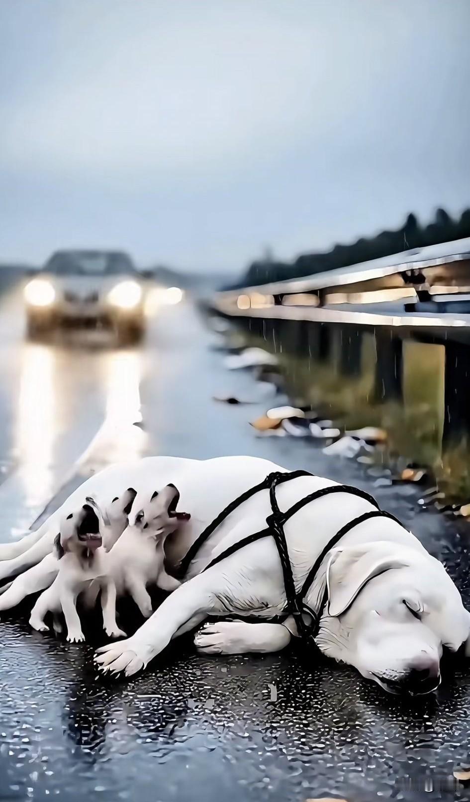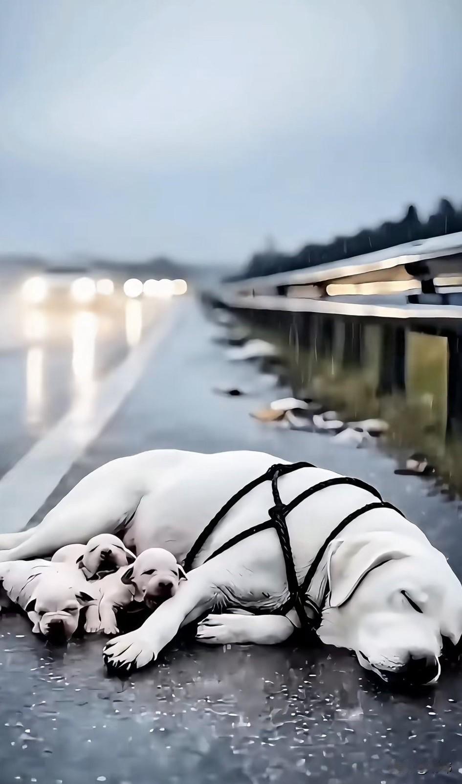 泪目了!一只可怜的狗妈妈被主人连同小狗一起遗弃在了一条马路上,这天还下起了大雨,