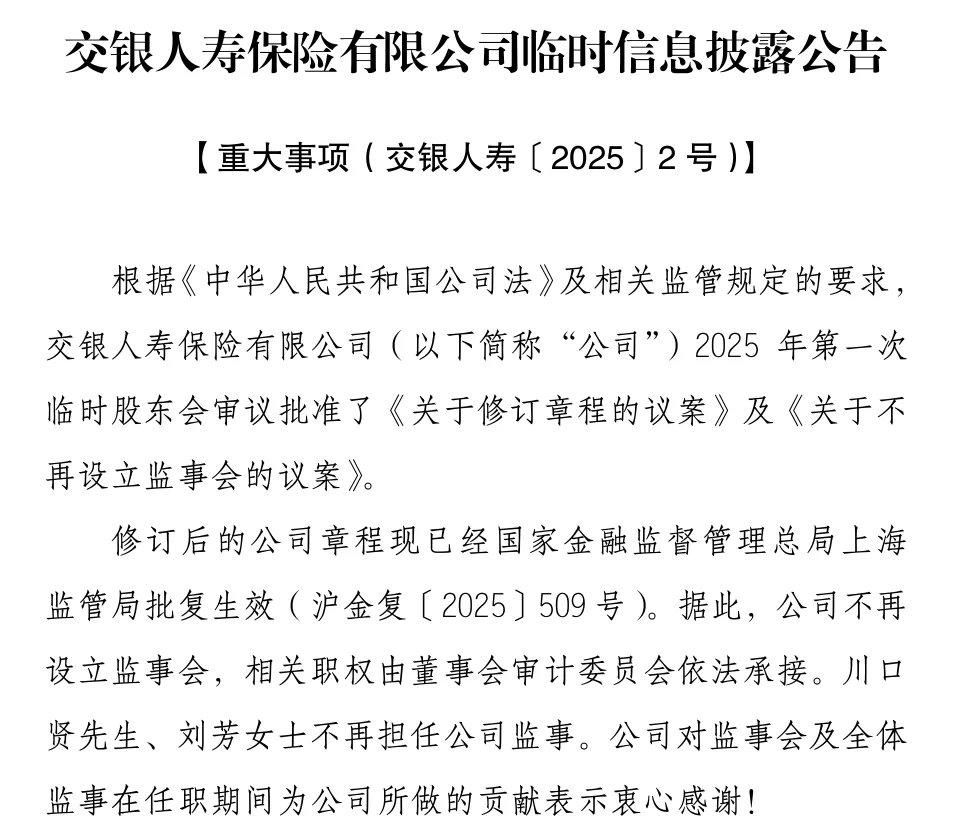 公告显示,经公司2025年第二次临时股东会及第五届董事会第十四次会议审议通过,且获得国家金融监督管理总局上海监管局任职资格核准,李亚正式出任交银人寿保险有限公司董事、董事长。与此同时,王庆艳不再担任该公司董事、董事长职务。