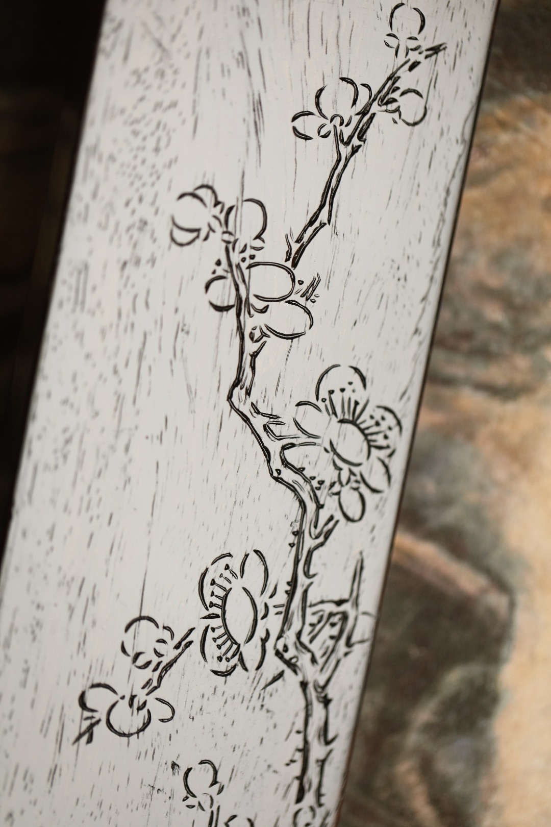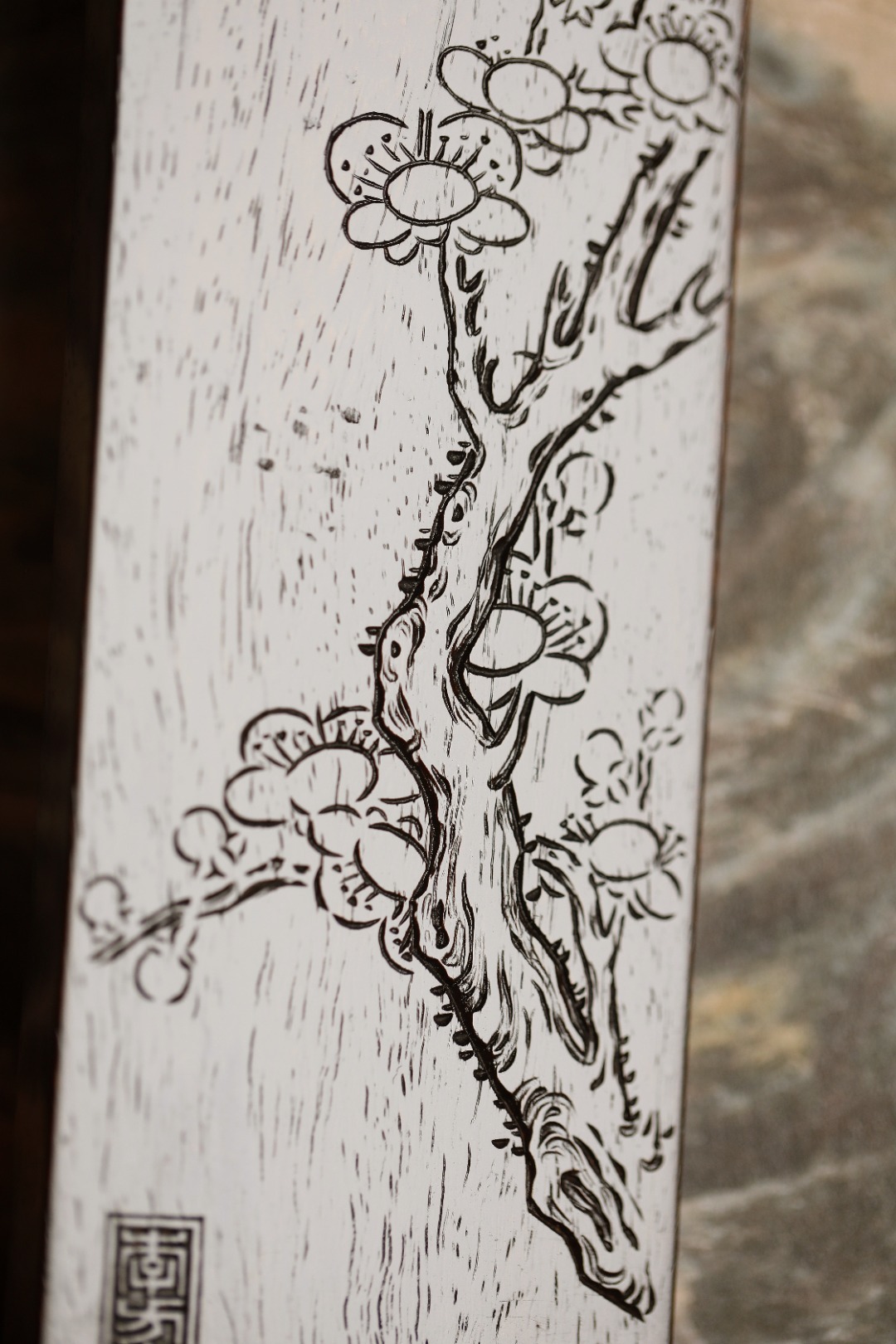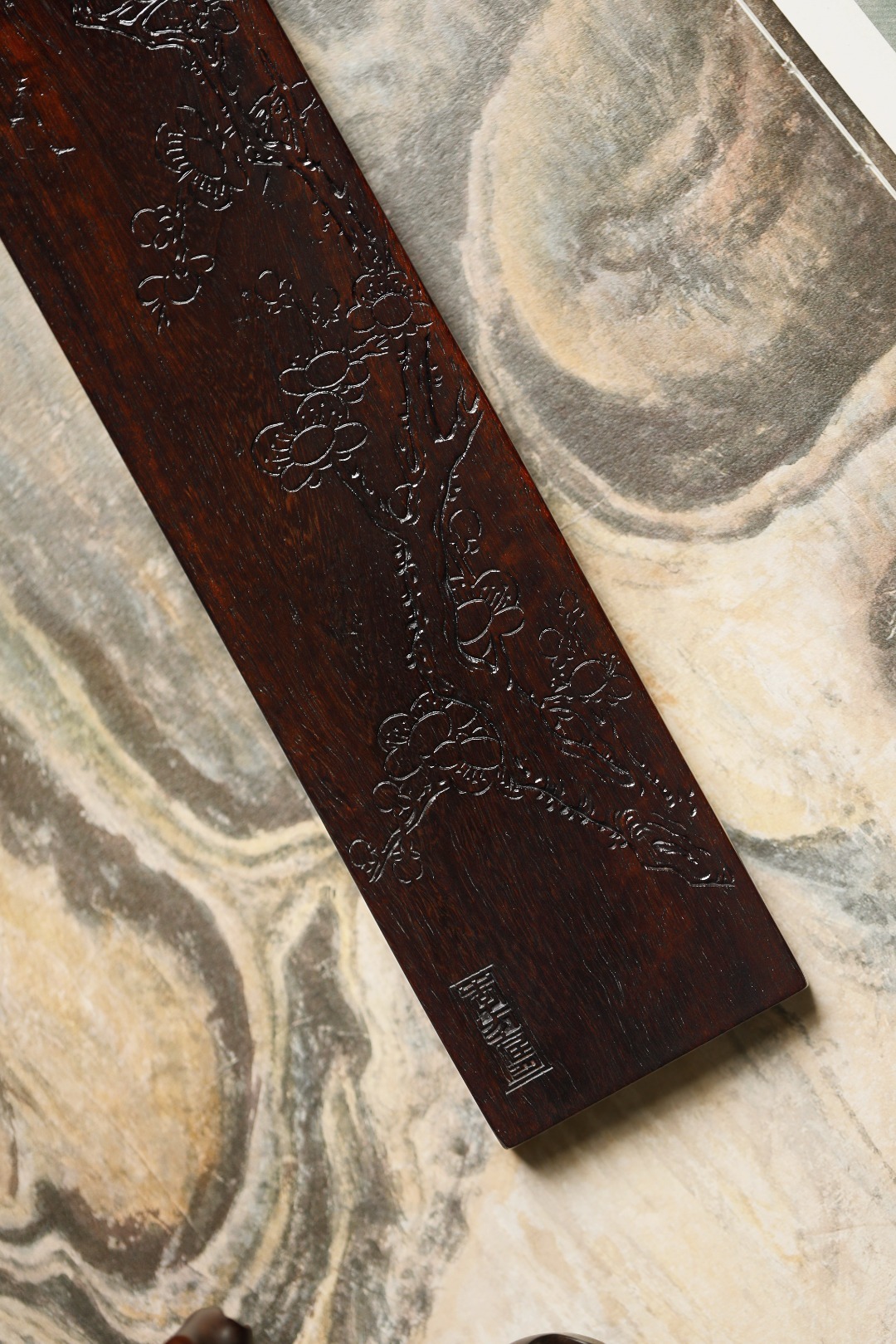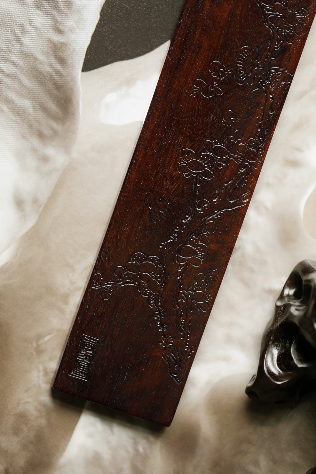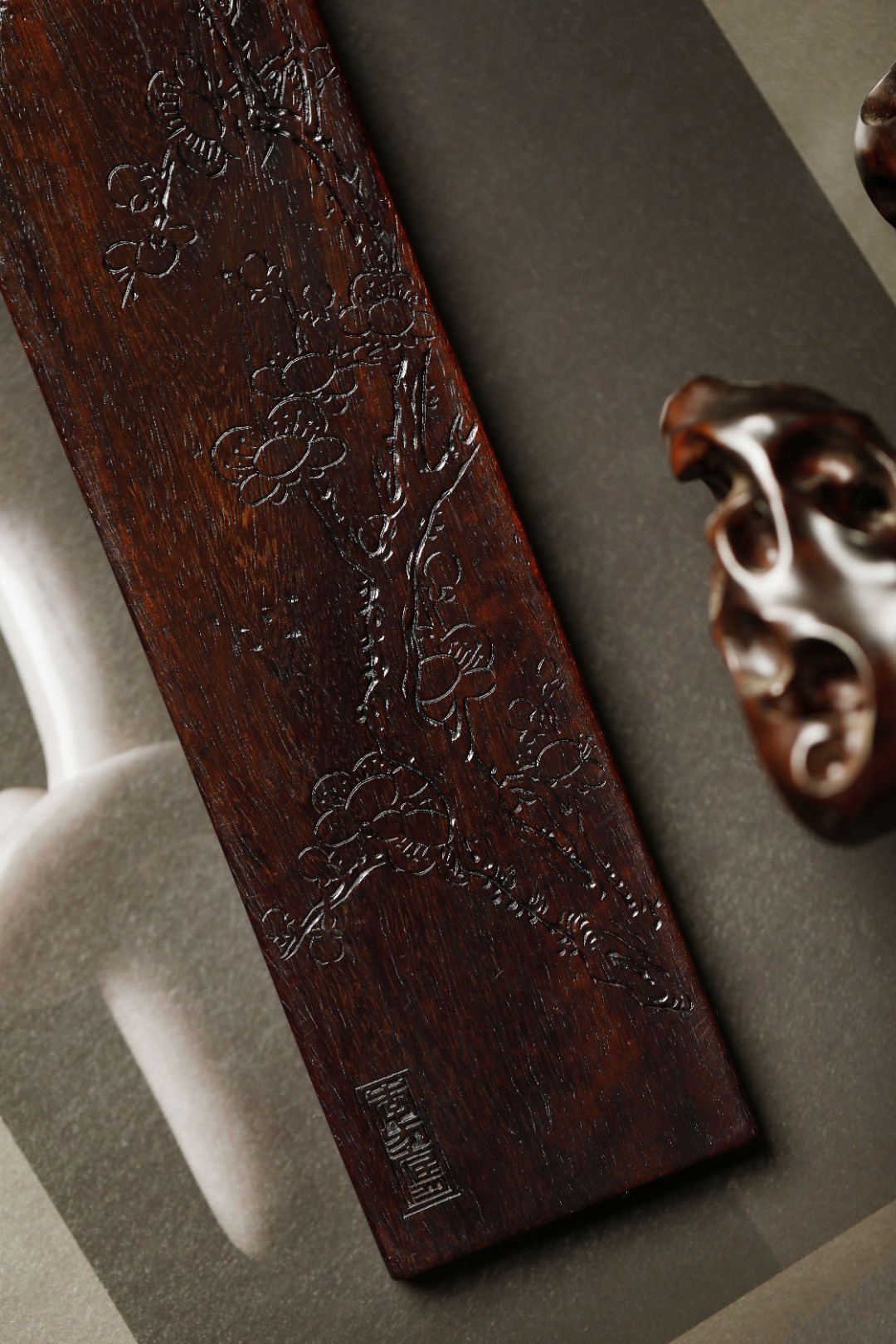 老紫檀 | 梅花文房纸镇经年老紫檀,包浆细腻坚沉,刀法细腻。手工阴刻梅花图,刀法