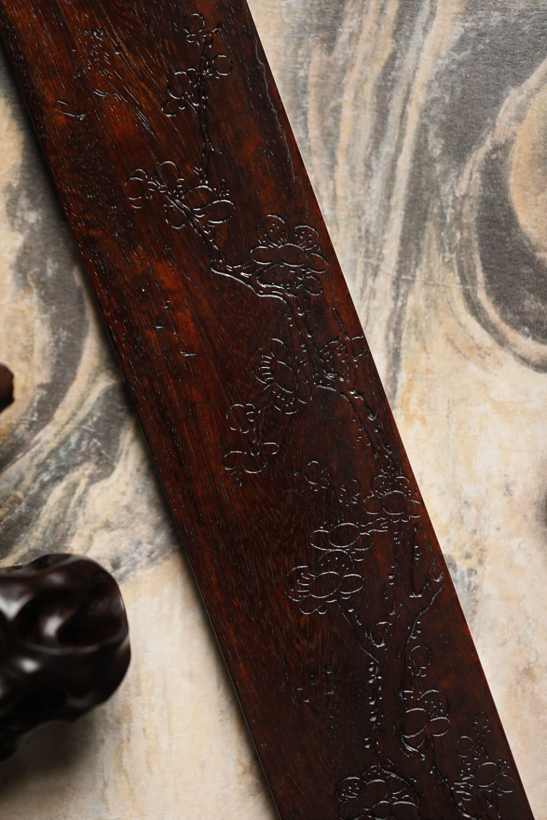 老紫檀 | 梅花文房纸镇经年老紫檀,包浆细腻坚沉,刀法细腻。手工阴刻梅花图,刀法细腻,线条柔婉逸丽;清趣盎然,堪称文房雅物。29.7*5.5*1.1cm 重203g