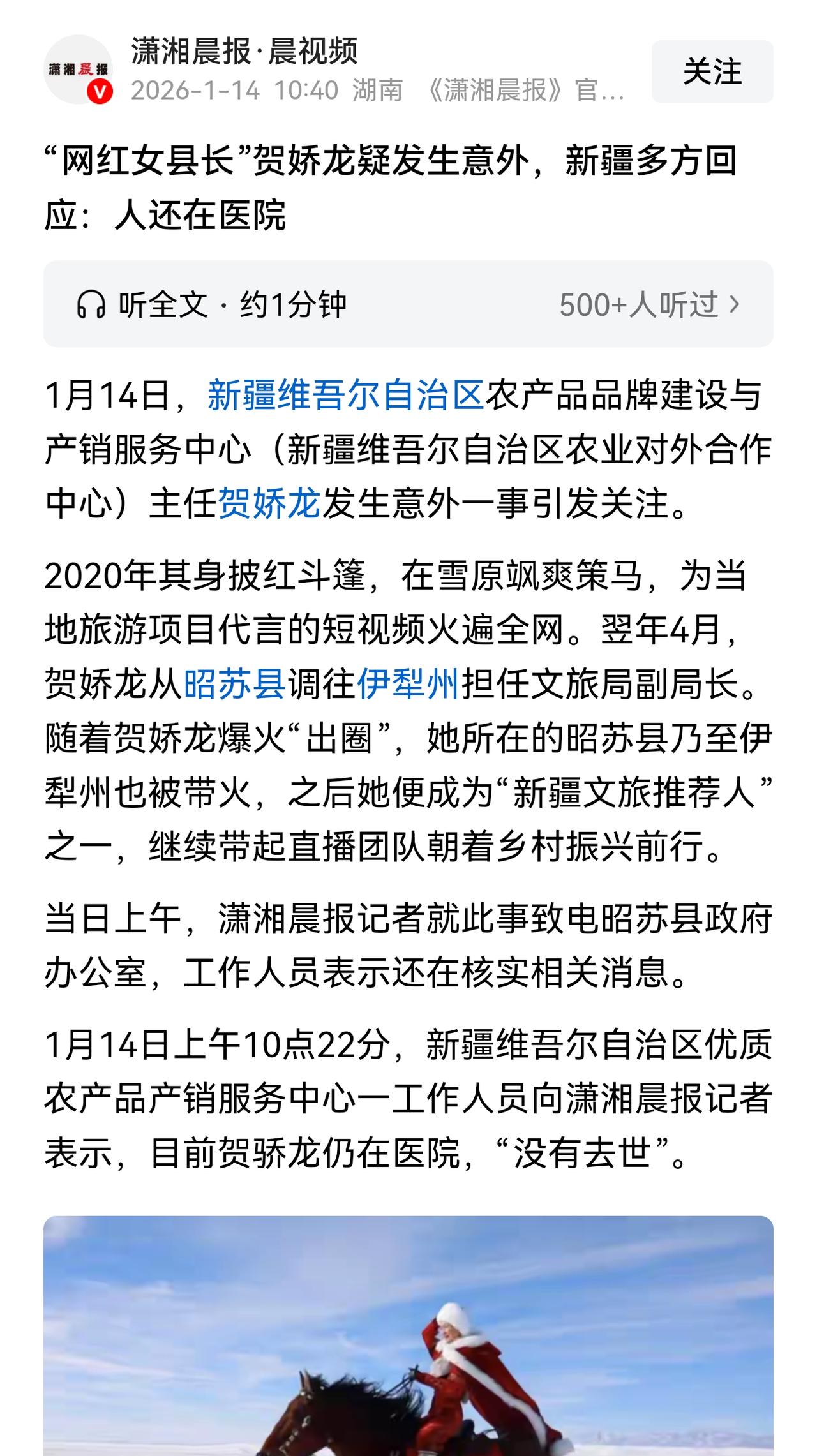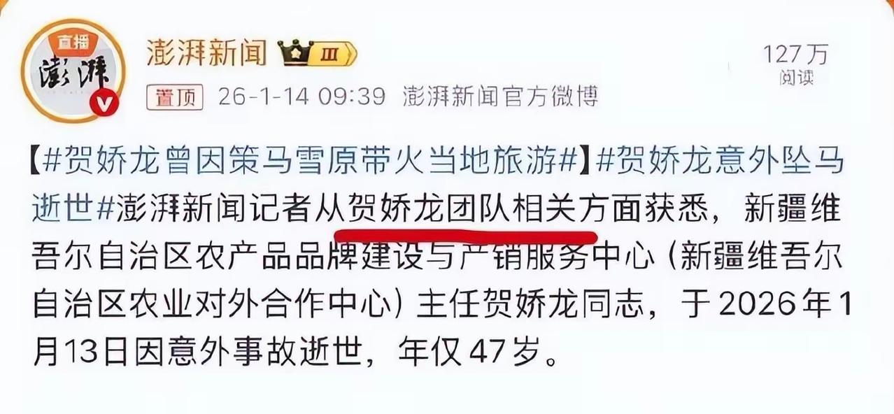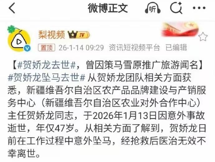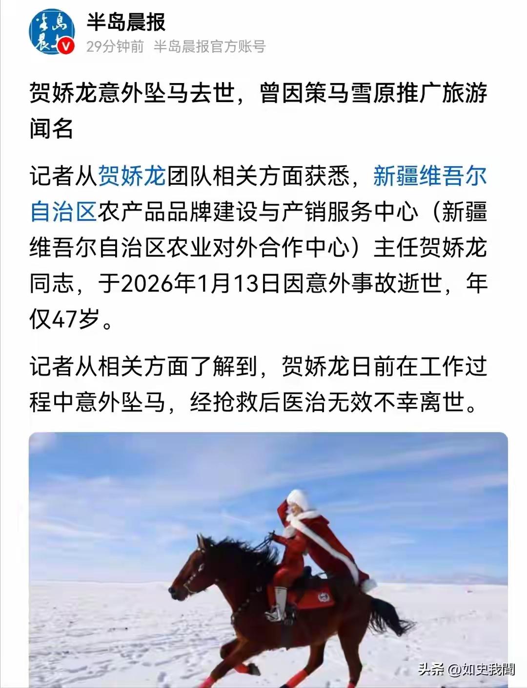 1月14日一大早,我手机不停地蹦出贺娇龙发生坠马事故去世的消息提醒,该事件迅速登上热搜。 我一直在着忙工作,还没来得及点进去细看,甚至连贺娇龙是哪号人物还没了解清楚,就传来了官方辟谣的消息。 据潇湘晨报消息:1月14日上午10点22分,相关单位的工作人员向其记者表示,目前贺骄龙仍在医院,没有去世。 贺娇龙现任“新疆维吾尔自治区农产品品牌建设与产销服务中心主任”的职务,为“新疆文旅推荐人”之一。 2020年其身披红斗篷,在雪原飒爽策马,为当地旅游项目代言的短视频火遍全网。 贺娇龙为乡村振兴立下汗马功劳,直播带货3.6亿元、带动百亿曝光,收获众多粉丝。 当粉丝得知贺娇龙离世的消息,哭晕了一大波,得知是谣言,又破涕大笑。 为何贺娇龙人明明还在医院,却被谣传为去世。 我们不禁要反思一下:在这个爆炸消息就是上热搜,热搜约等于泼天的流量+泼天的富贵。 在这个极具的诱惑又浮躁的时代,太多想一炮而红的人了,急躁到不需要去核实事情的真相,就盲目报道或者跟风。 无论是对当事人、还是广大粉丝所造成的伤害,都是以消耗你的诚信为代价,结果只会适得其反。 无论是做新闻还是做人,道理都一样,我们都要有自己正确的认知和判断,不能人云亦云,随波逐流。 真实性+可靠性,才是你能走得更好、更远的根基。 最后,祝贺娇龙早日康复!再带我们领略更多新疆的风采和美食。 贺娇龙