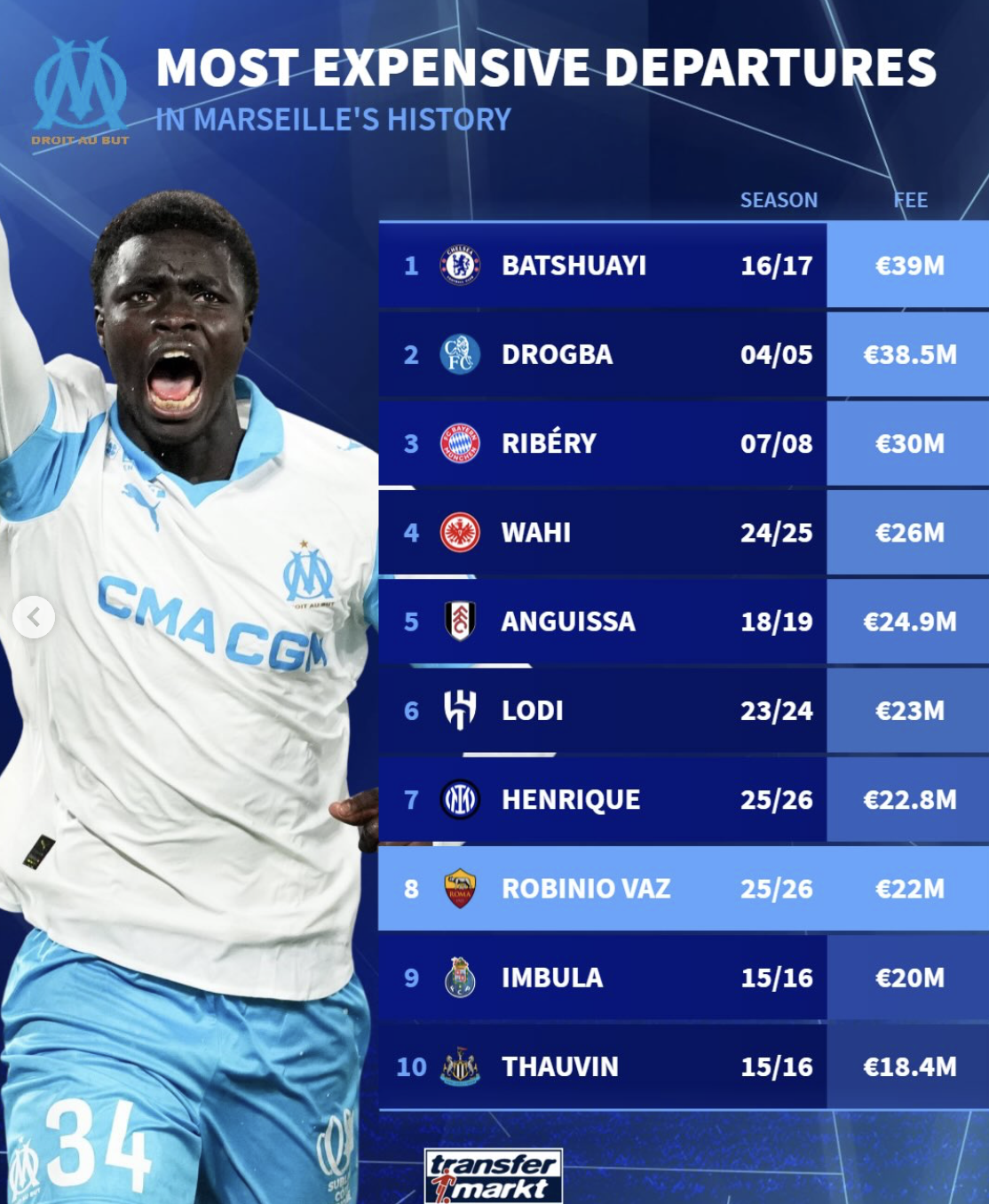 虎扑01月15日讯德转统计了马赛历史最贵转出球员排行榜。