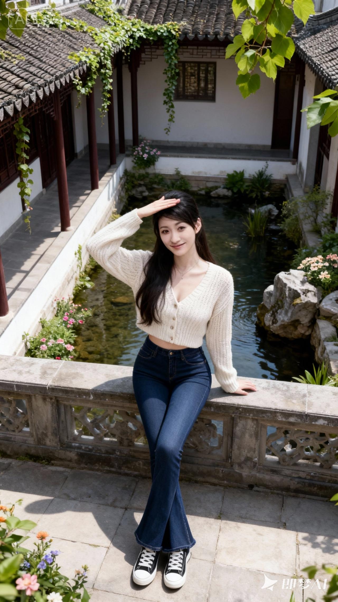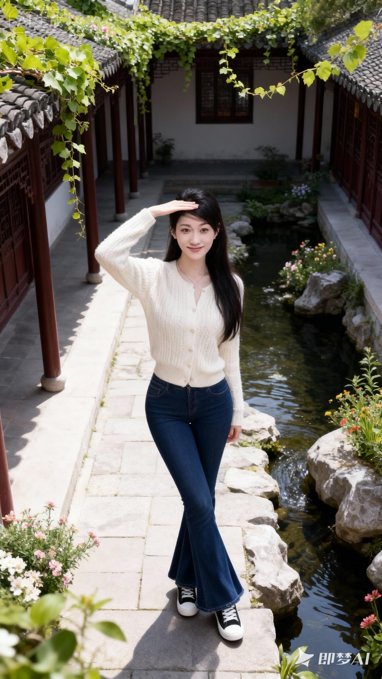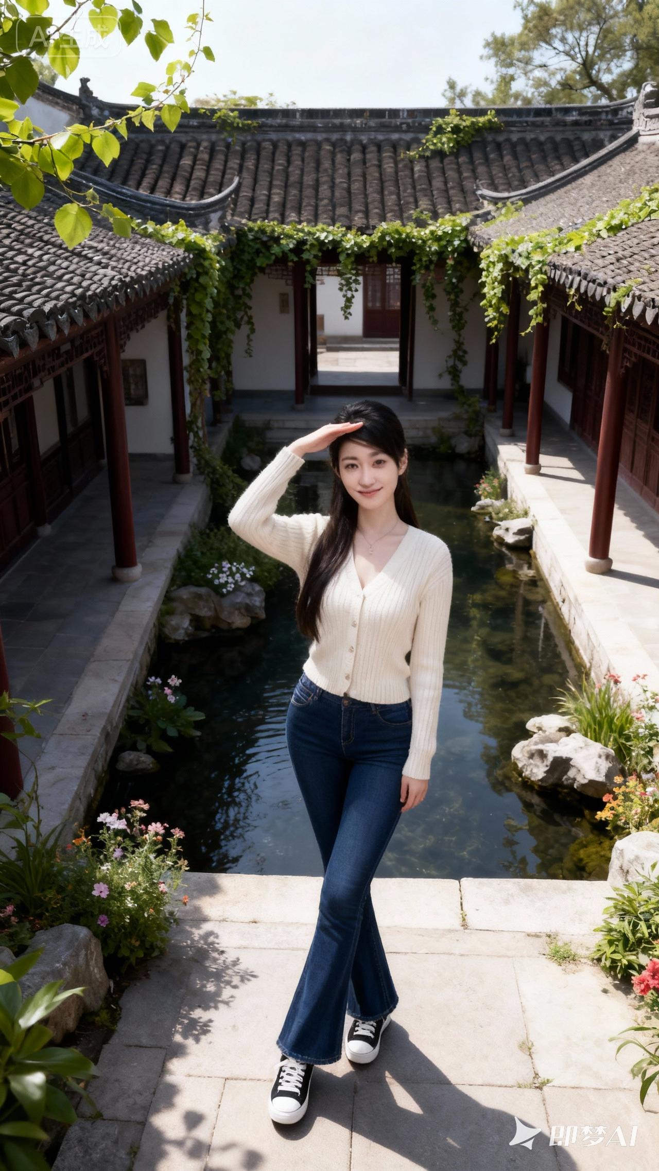 在古风庭院中,她优雅地摆出姿势,仿佛穿越时空的少女。