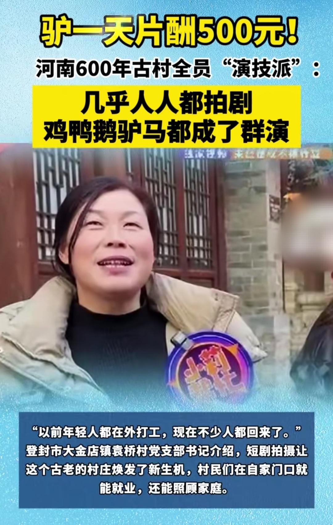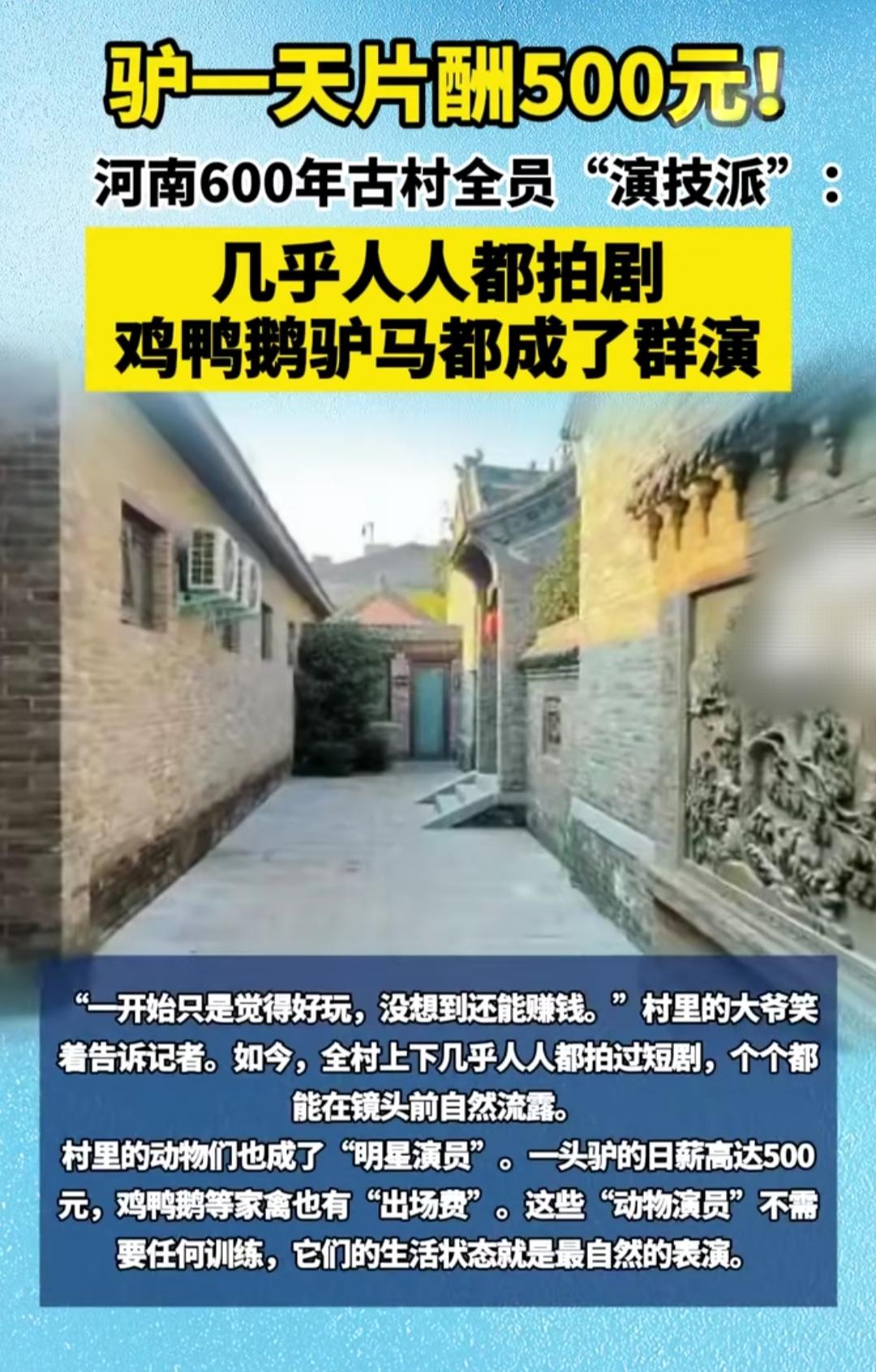 河南这600年古村也太会整活了——现在谁家驴一天能挣500块?这村的驴能!连鸡鸭鹅马都成了剧组抢着要的群演,村民更牛,全员变身“演技派”。 一开始谁也没当真,大爷说“就是凑个热闹,没想到拍个戏还能赚零花钱”。结果现在全村几乎人人拍过短剧,往镜头前一站,端碗吃饭、坐在门口唠嗑,那股生活味儿比专业演员还自然,连动物都不用训,日常状态就是戏。 更让人感慨的是,以前年轻人全往城里跑,现在不少都回村了。家门口就能挣钱,还能守着老人孩子,600年的老村子,靠这“拍戏营生”愣是活泛了起来。你说这算不算把日子过成了最接地气的剧本?