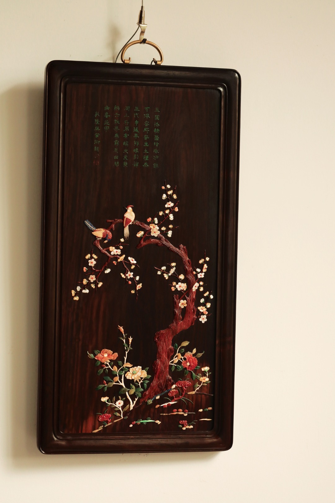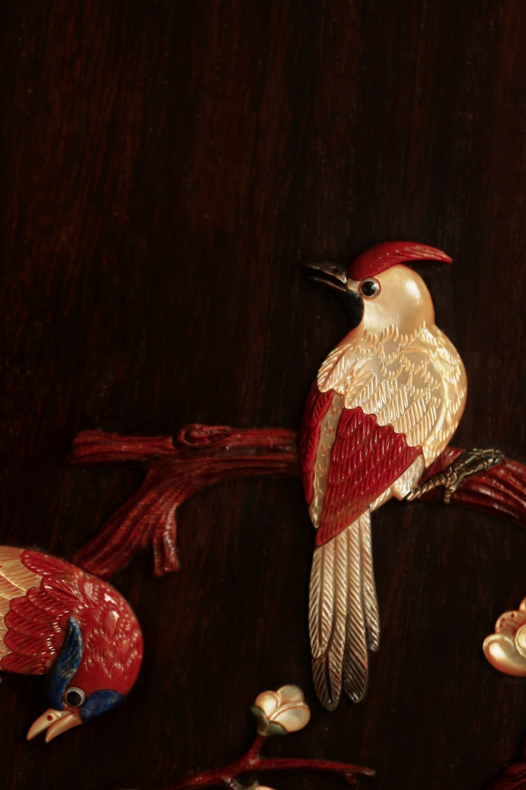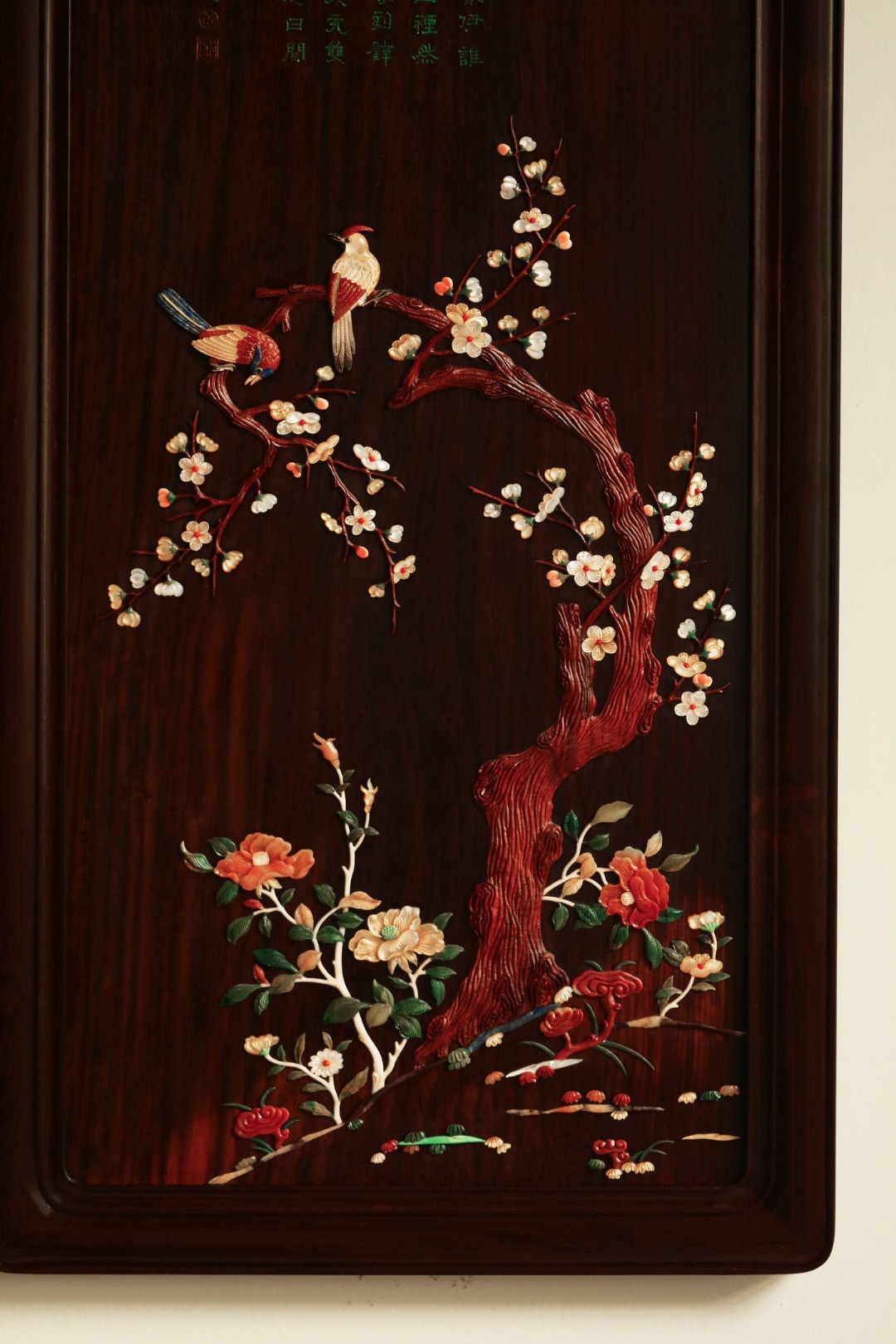 酸枝×百宝嵌 | 喜上眉梢 挂屏 大红酸枝独板制,承循宫廷技艺,集多材质于一体。 屏心百宝嵌作花鸟图, 错落清雅,为厅堂书斋陈设上选。65.5*34*2cm 重3055g