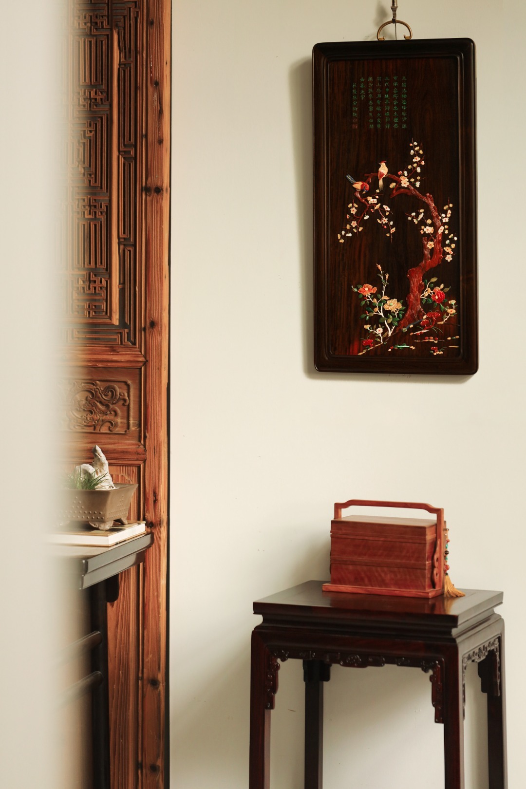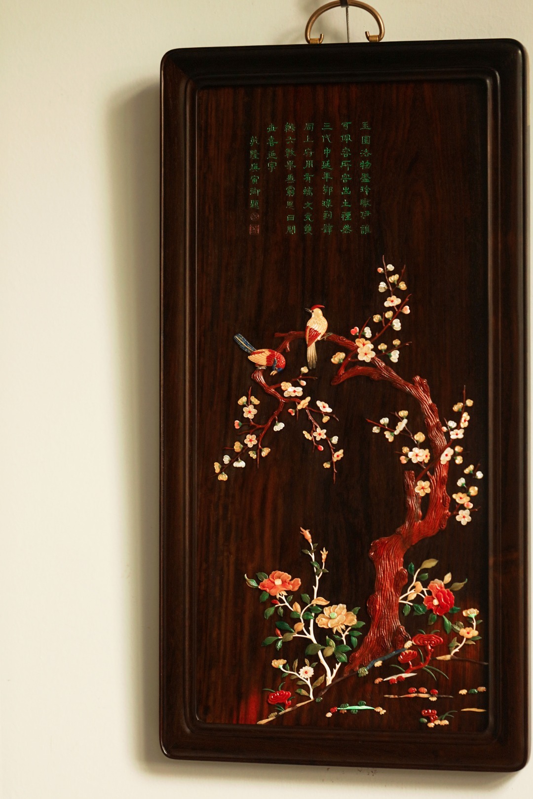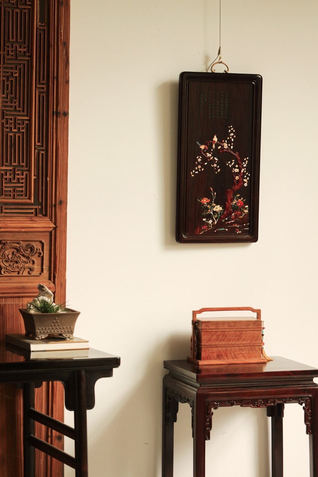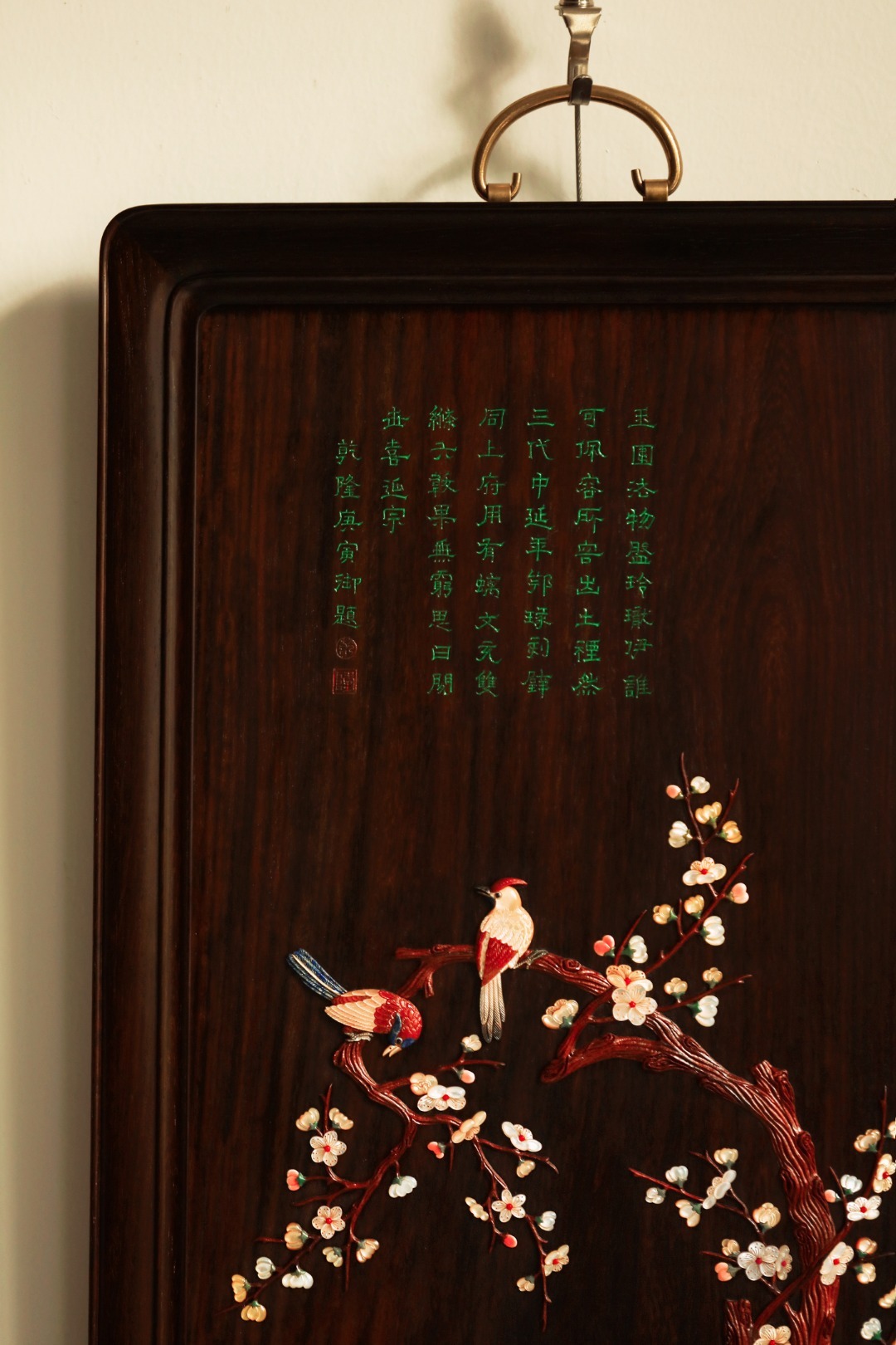 酸枝×百宝嵌 | 喜上眉梢 挂屏 大红酸枝独板制,承循宫廷技艺,集多材质于一体。 屏心百宝嵌作花鸟图, 错落清雅,为厅堂书斋陈设上选。65.5*34*2cm 重3055g