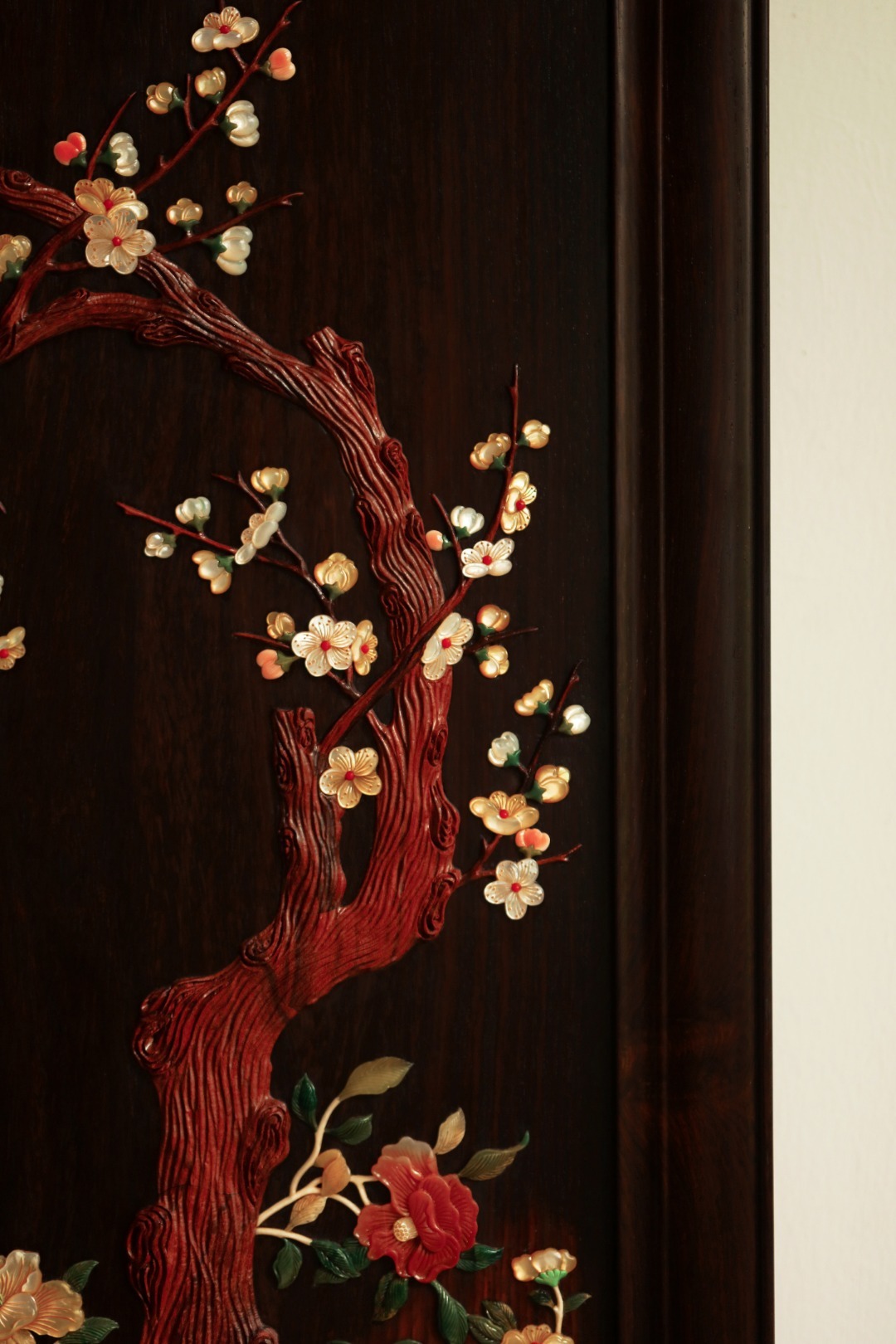 酸枝×百宝嵌 | 喜上眉梢 挂屏 大红酸枝独板制,承循宫廷技艺,集多材质于一体。