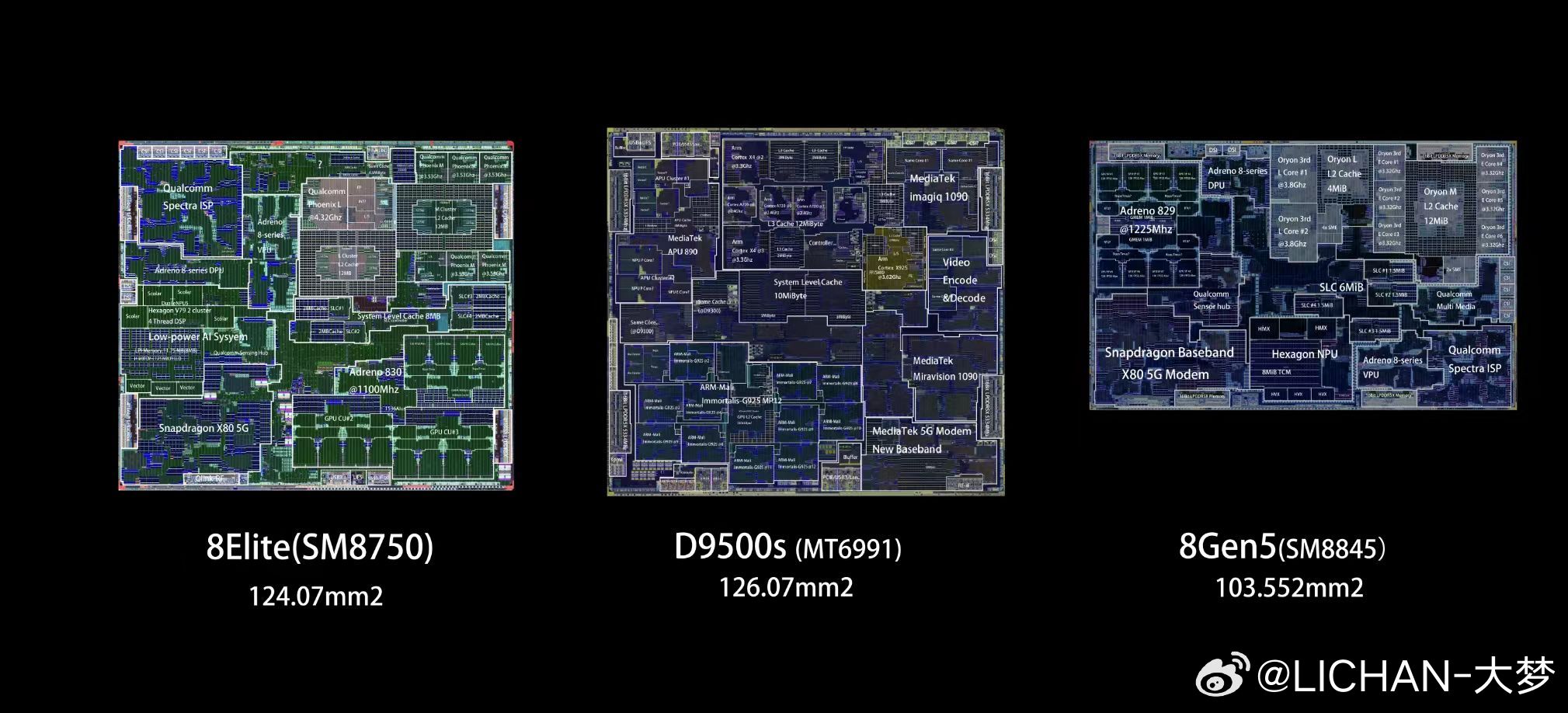 联发科发布了天玑9500s,这块芯片有点意思,虽然定位主要是中端机使用,但它的性能真的完全不输旗舰~首先是工艺上,采用了3nm的制程(台积电N3E),然后你再看芯片面积,也几乎与8Elite一样,远强于骁龙8Gen5。而且用的还是4超4大全大核架构,跑分可以超过360万,所以性能真的非常强悍。GPU这块儿用的也是顶级12核G925,还有大缓存,L2和SLC甚至持平天玑9500。这次红米的Turbo 5 Max也会首发这块芯片,我感觉性能和体验都会很不错,期待本月发布会了~