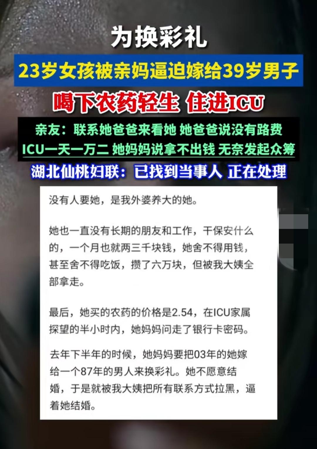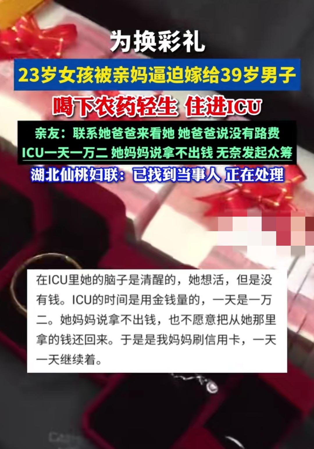 谁能想到,23岁本该自由绽放的年纪,湖北仙桃这位姑娘却要被迫接受命运安排。家人硬是要她嫁给大16岁的男人,多次反抗无果后,她选择喝下农药,如今还在ICU里挣扎,生死未卜。 好好的姑娘为何走到这一步?网友翻出细节,说是双方家庭早有约定,姑娘一直不同意,可家人轮番施压,没给她半点退路。有人晒出她之前的求助信息,字里行间全是绝望,让人看了忍不住揪心。 目前当地妇联已经介入回应,说正在核实情况,会尽力保障姑娘的权益。可网友们却停不下来讨论,有人心疼姑娘的遭遇,有人疑惑家人为何如此固执。这件事到底会有怎样的结果?只能等着进一步消息。