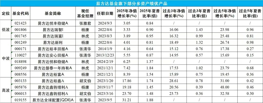 其中,低波产品会严格控制权益资产的暴露比例,对波动率也有严格限制;而中波、高波产品对权益资产的配置有更宽的区间,可利用股票、转债等获取长期显著高于债券的收益。无论是低波、中波还是高波类型,易方达基金均打造出中长期绩优代表产品。