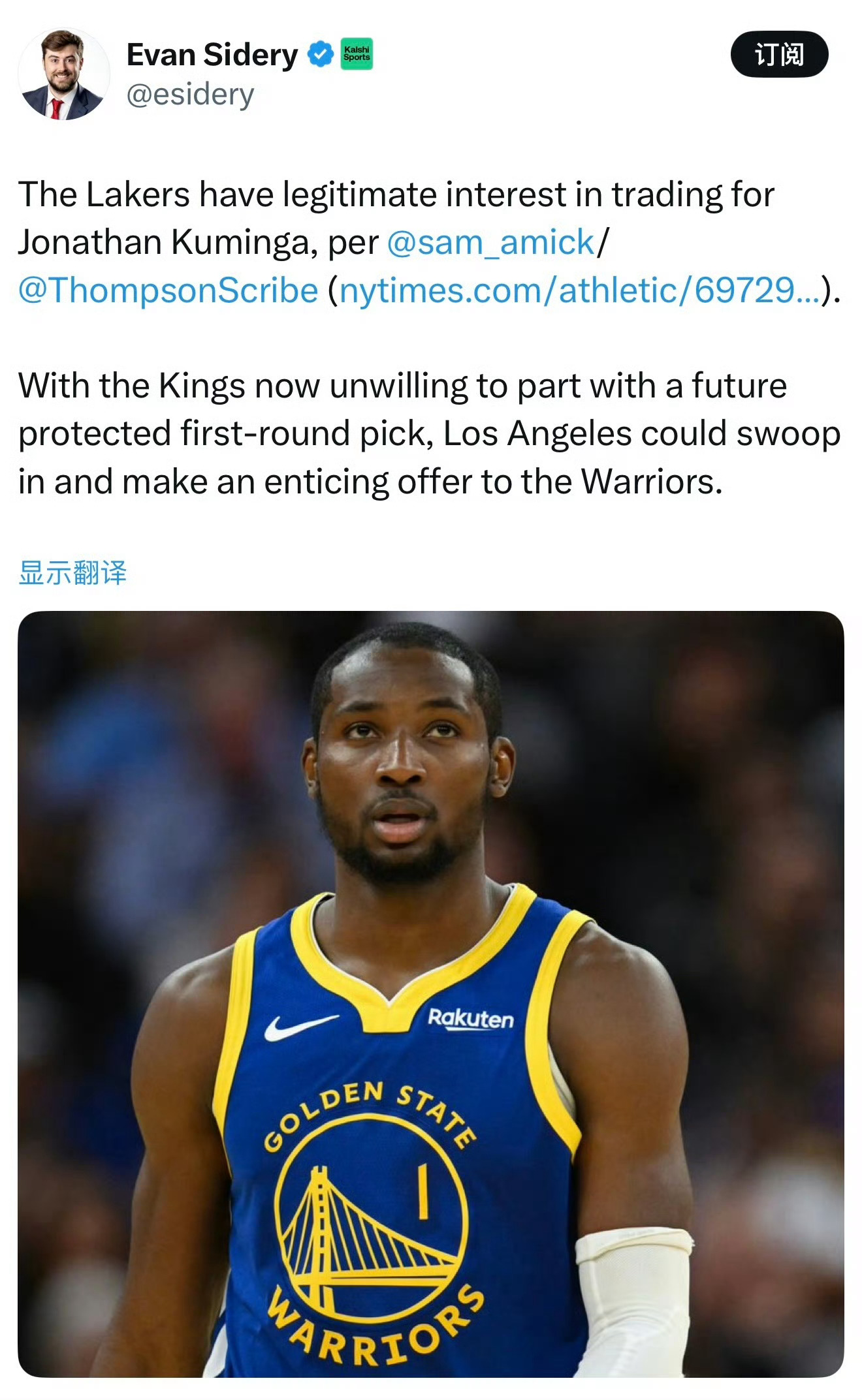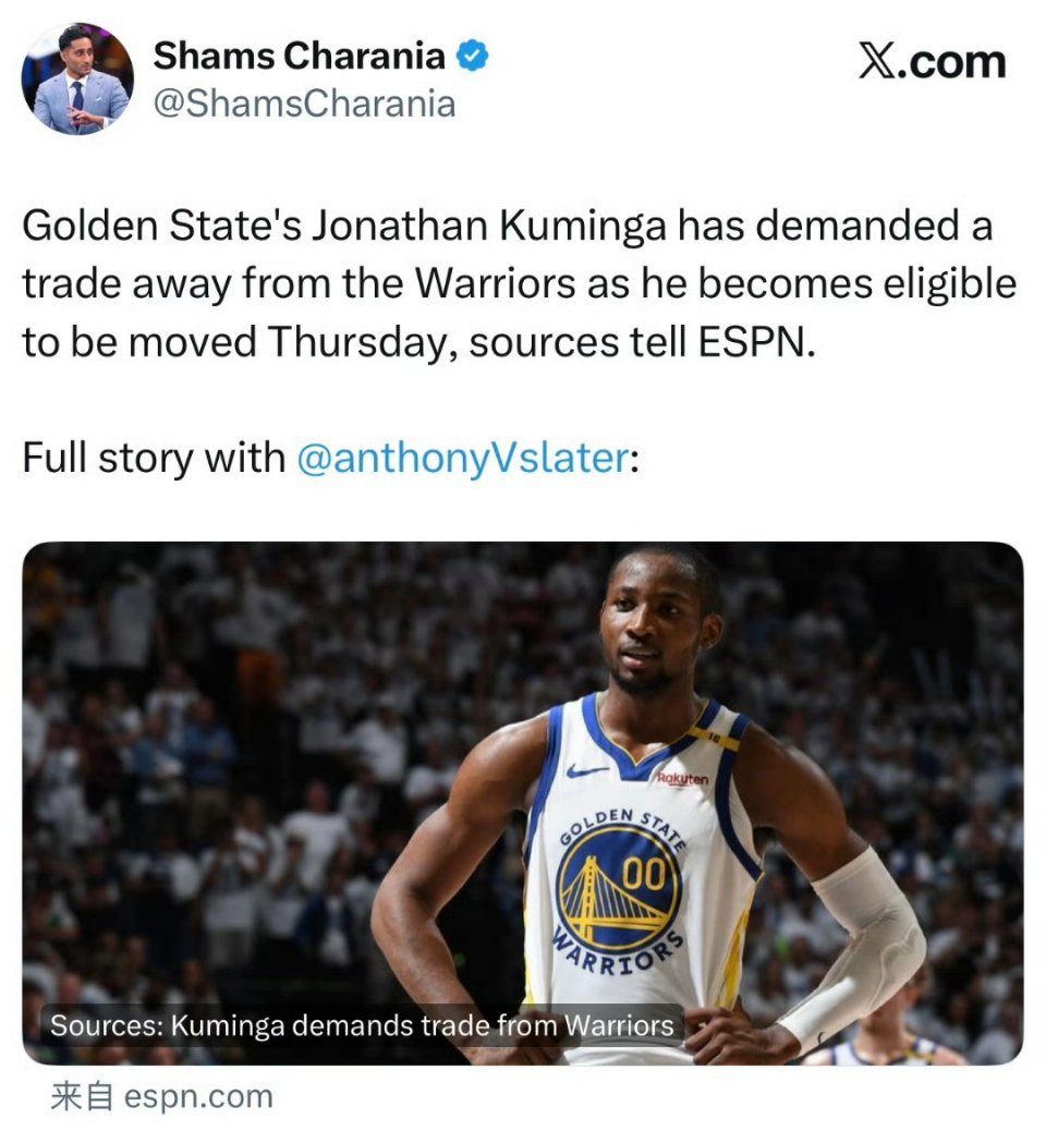 库明加不想和库里一起打球,已经申请交易!勇士记者Dalton Johnson报道,湖人总经理佩林卡十分看好库明加,认为库明加作为运动能力出众的侧翼球员,很适合在以东契奇为核心的球队中效力。黄蜂vs湖人尼克斯vs勇士库明加申请交易