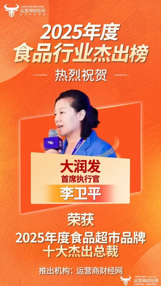 近日,由国内知名财经媒体运营商财经网独家编制的“2025年度食品超市品牌十大杰出总裁”榜单正式公布,大润发首席执行官李卫平成功入选!