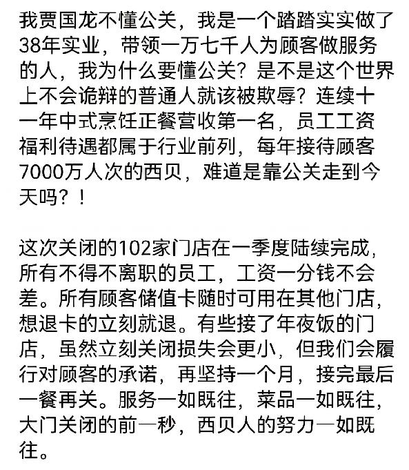 西贝将关闭102家门店, 都到这个时候了, 没想到贾老板还在嘴硬,称西贝是遭到了污蔑。 我们先简单来捋一下,西贝到底是怎样从当初的人挤人走到如今门店冷冷清清的。 老罗吃了一顿西贝觉得不值,然后就发文吐槽了一下,然后贾老板跳出来态度强硬的表示:我们不用预制菜。 为了自证清白,贾老板开放了后厨,结果什么18个月的鲈鱼、24个月的西兰花、允许隔夜再上的羊排...通通被网友扒了出来。 西贝定位的是中高端,价格自然也不便宜,消费者看在环境不错、食材新鲜、请客或带家里人来能吃个安心,贵就贵点吧。 结果花了这么多钱,吃的竟是这样的菜品,这让消费者感受到了深深的欺骗。 面对消费者的愤怒,贾老板没有安抚、没有道歉,反而搬出行业标准来暗示顾客“不懂行”。 产品糊弄我们就算了,连态度居然也这么傲慢,这下算是彻底把消费者给推到了对立面。 所以西贝的凉凉,从来不是什么“预制菜之争”,而是价值与价格的不对等,是信息不透明,是态度的不真诚。 贾老板要是没意识到这个问题的话,再怎么说,消费者也是不会买账的。 你们觉得呢?欢迎来评论区留言讨论~