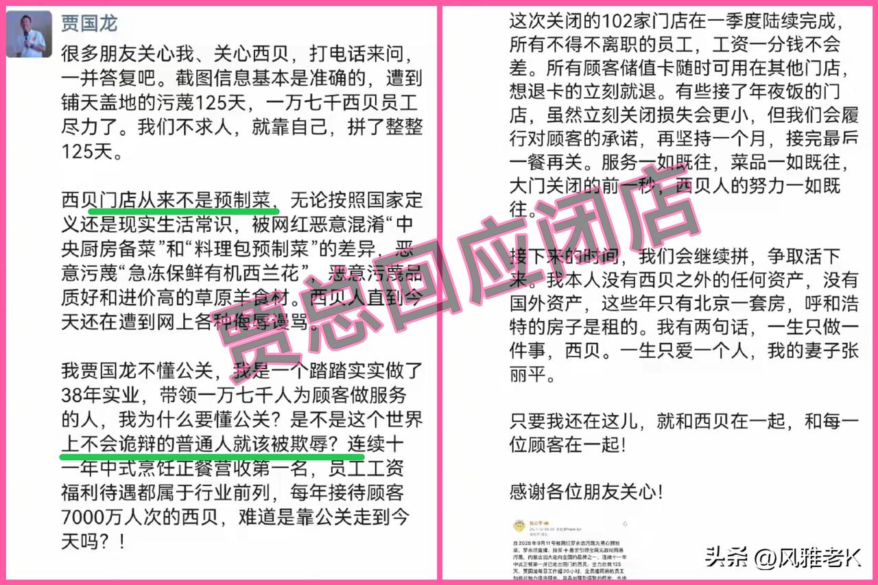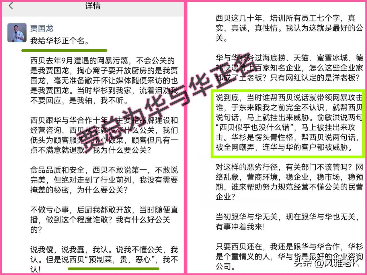 罗永浩 看到 贾老板 这话,会不会又要与贾来一场二番战? 贾老板发圈公开说📢“谁帮西贝说话就带领网暴攻击谁。” 👀回顾“西贝风波”过程: 导火索是罗作为消费者,评价了一句“预制菜,贵且不好吃”。贾总表示不服,要硬刚到底... 紧接着,便是贾老板“开放厨房”、“煽情文案”...一系列自证清白的迷之操作。 随后便是扒出“西兰花🥦”、“鸡汤里没有鸡🐔”...一系列问题,越抹越黑。 而后引爆了舆论争议,网友的“嘘声”越来越高涨,呈现出舆论一边倒的态势。 整场舆论风暴,貌似都是贾总的一系列迷之操作引爆,有没有像他口中的“带领人”,不得而知! 说到底,群众的眼睛是雪亮的,都有辨是非的自我判断能力,谁有理,谁就站得住脚。 网友群众是中立的,都是“帮理不帮亲”,更何况没有“亲”这层关系呢?🤣🤣 看贾总近日的连续两篇社交动态内容 闭门修炼几个月后的贾老板还是口服不服😂 是想通了,要借闭店引起的关注,再掀起一次风浪,扳回一局吗?