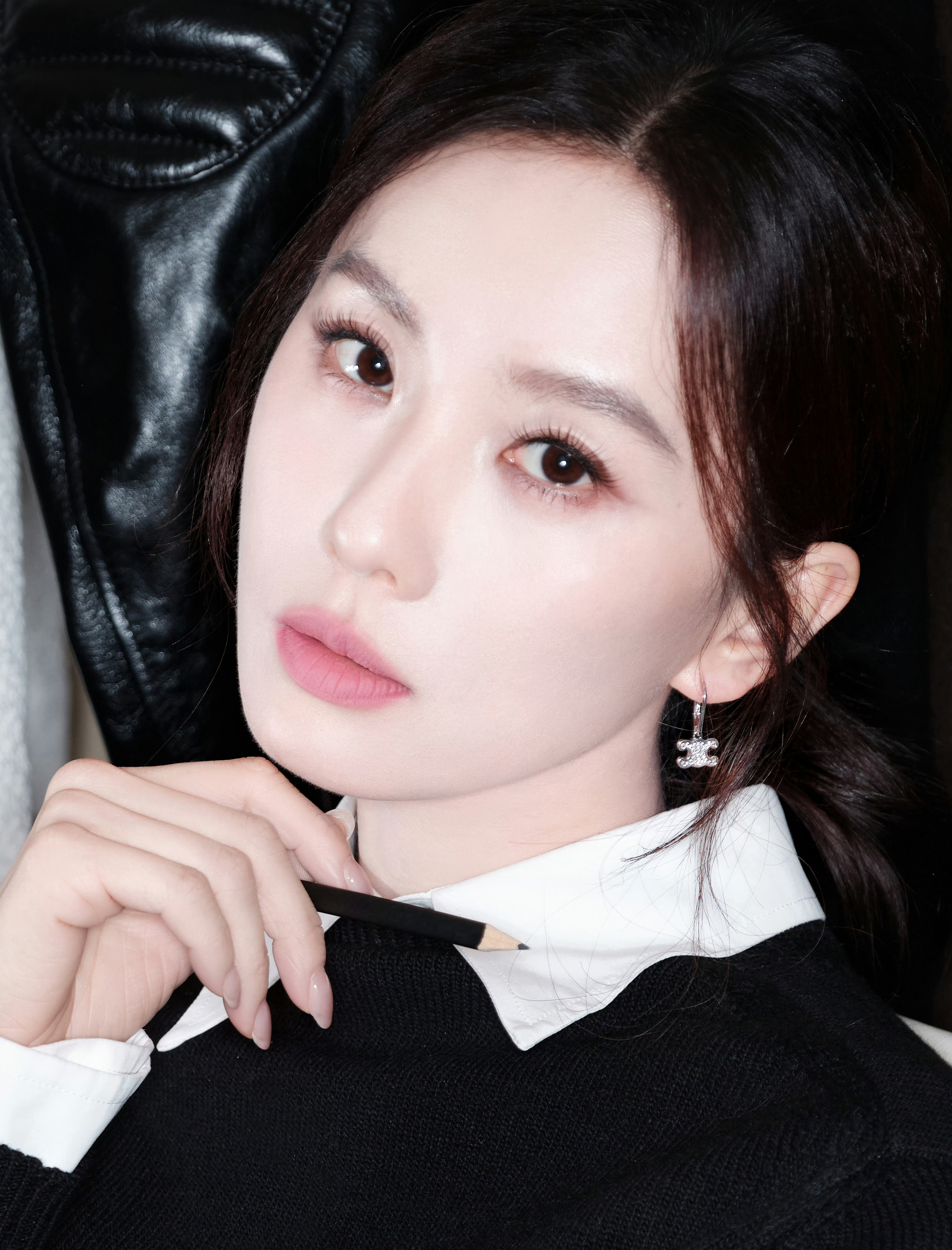 刘诗诗的松石绿缎面衬衫,利用面料的垂坠感中和了半裙的利落,打造出层次丰富的职场优