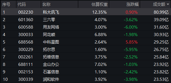 热门成分股多数回调,用友网络、拓尔思跌超5%,三六零跌超3%,同花顺跌2%;上涨方面,中科星图涨超5%,科大讯飞微涨。