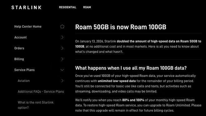相比之下,升级之前的50GB套餐则要求用户按1美元/GB的价格为额外数据付费,否则SpaceX将在当月剩余时间内切断用户的访问权限。