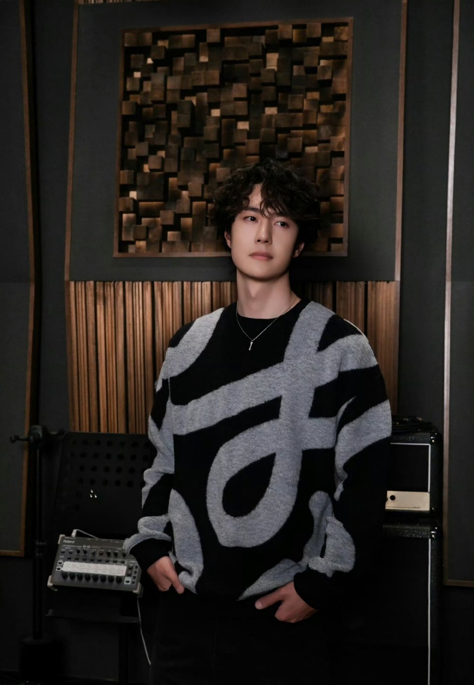 王一博灰黑毛衣小卷毛录音棚里的氛围感神图,小卷毛+毛衣,是心动的感觉💓