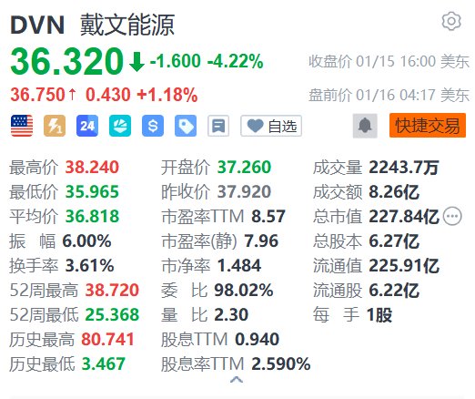 昨日收跌4.22%的戴文能源(DVN.US)今日美股盘前涨1.18%,而CoterraEnergy(CTRA.US)昨日盘中一度大涨超12%,最终收涨1.46%。有媒体援引知情人士透露,CoterraEnergy正探讨与戴文能源合并的可能性。这两家页岩油气勘探商若成功联手,将成为近年来规模最大的石油天然气交易之一。知情人士表示,两家均在油气资源富集的二叠纪盆地持有大量资产的公司,正在就潜在合并事宜展开磋商。他们还透露,双方讨论的方案之一为全股票交易。(格隆汇)