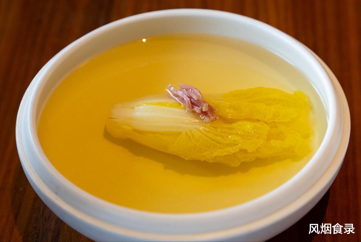 老黄心里憋着口气,非得争这口气,用北方大白菜心配老母鸡、鸭子、火腿蹄子慢火熬,再拿鸡胸肉茸反复“扫汤”,把汤吊得跟白开水一样透亮,这才一雪前耻。
