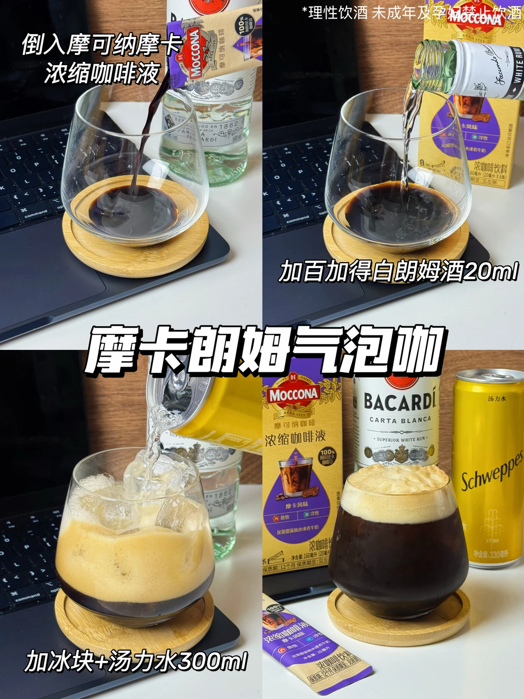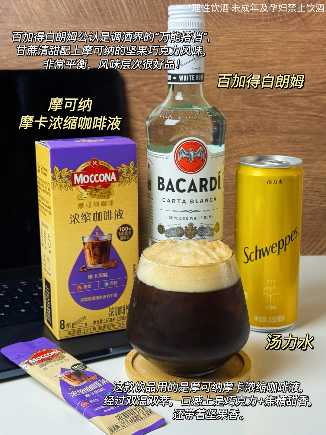 摩可纳摩卡浓缩咖啡液+百加得白朗姆酒20ml+冰块+汤力水300ml