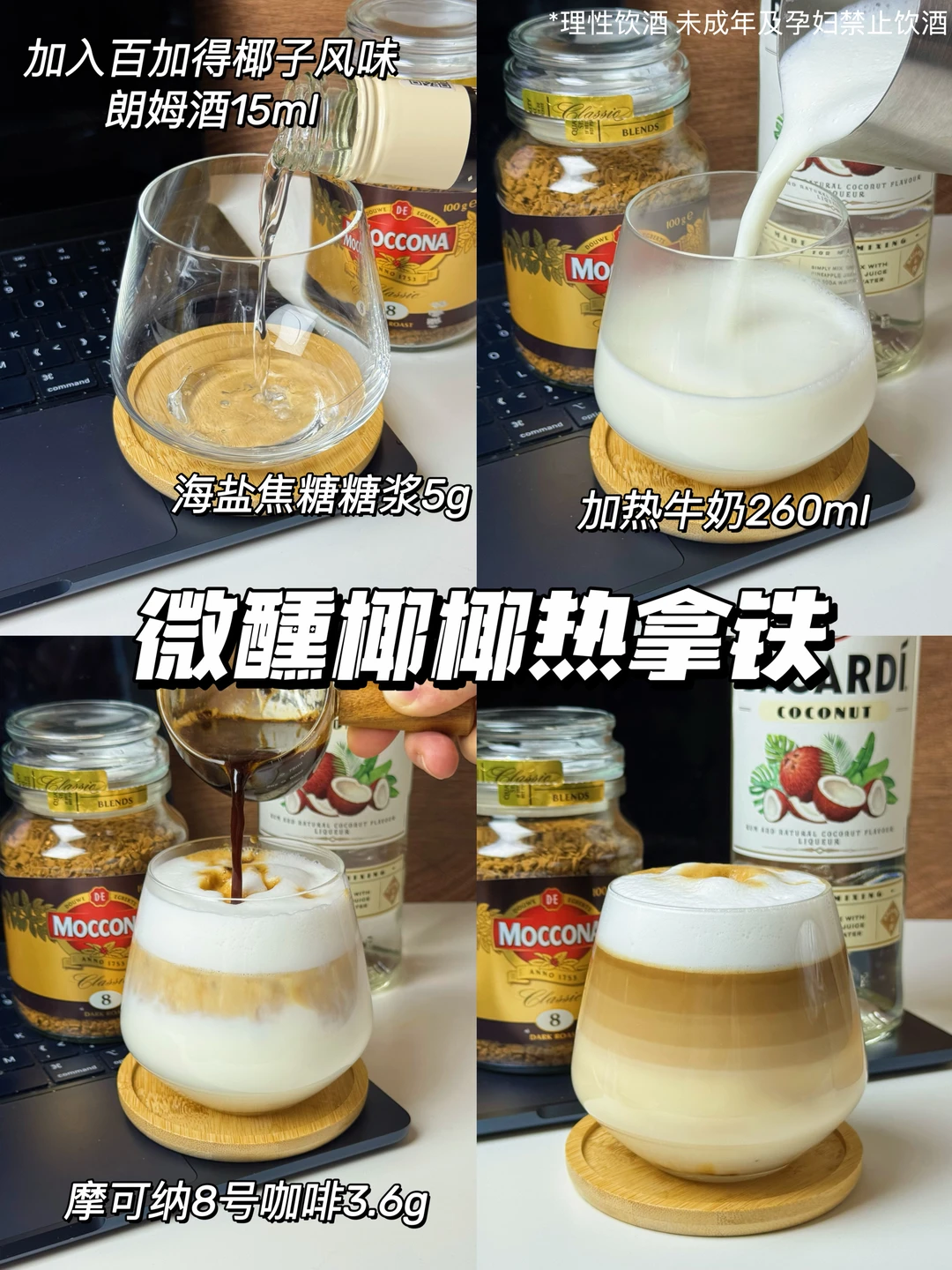 摩可纳8号咖啡3.6g+热牛奶260ml+百加得椰子风味朗姆酒15ml+海盐焦糖糖浆5g