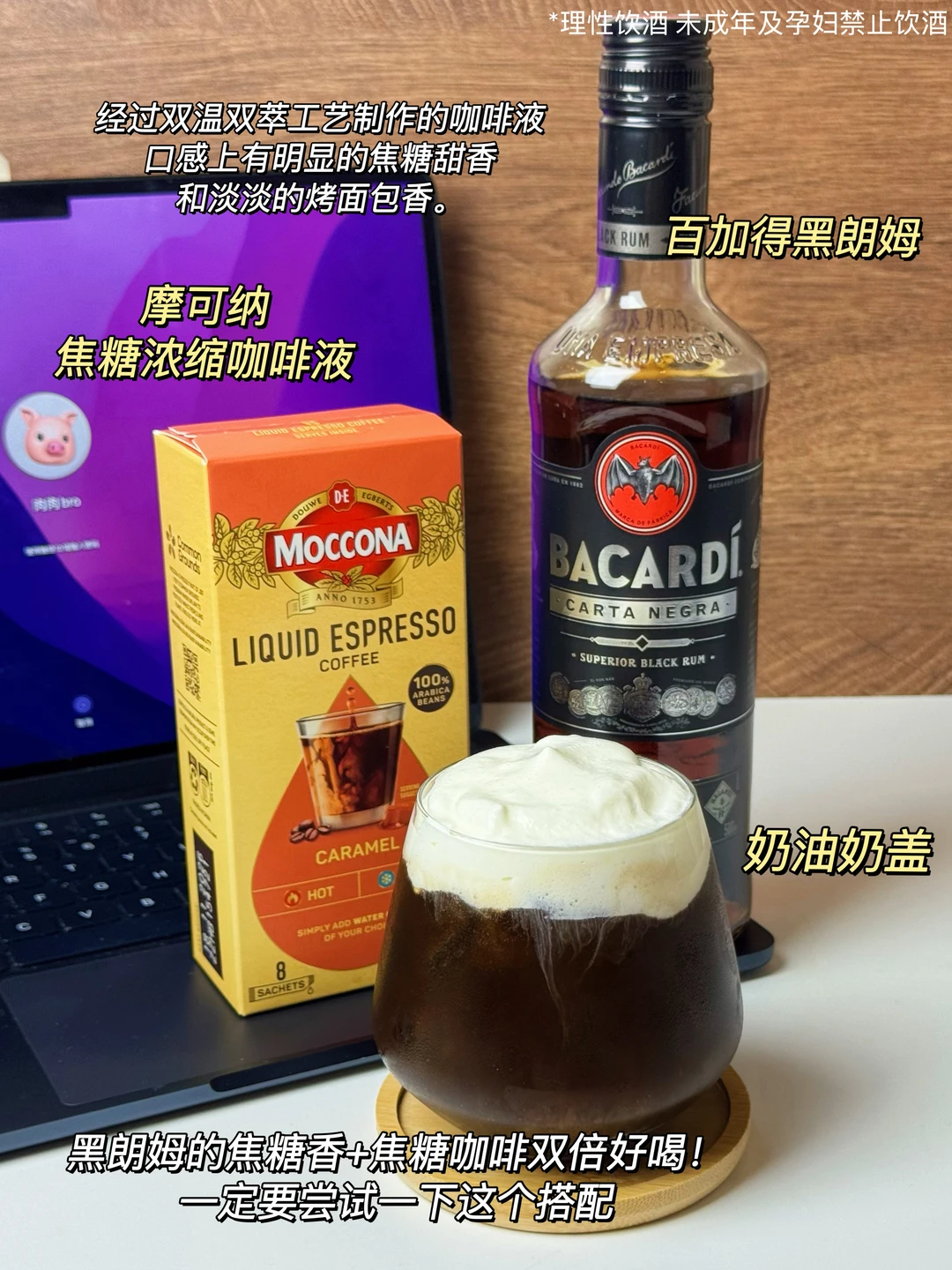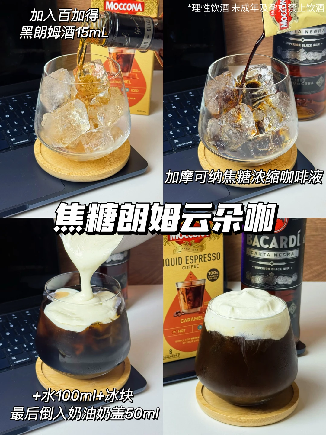 摩可纳焦糖浓缩咖啡液+百加得黑朗姆酒15mL+水100ml+淡奶油50ml+冰块