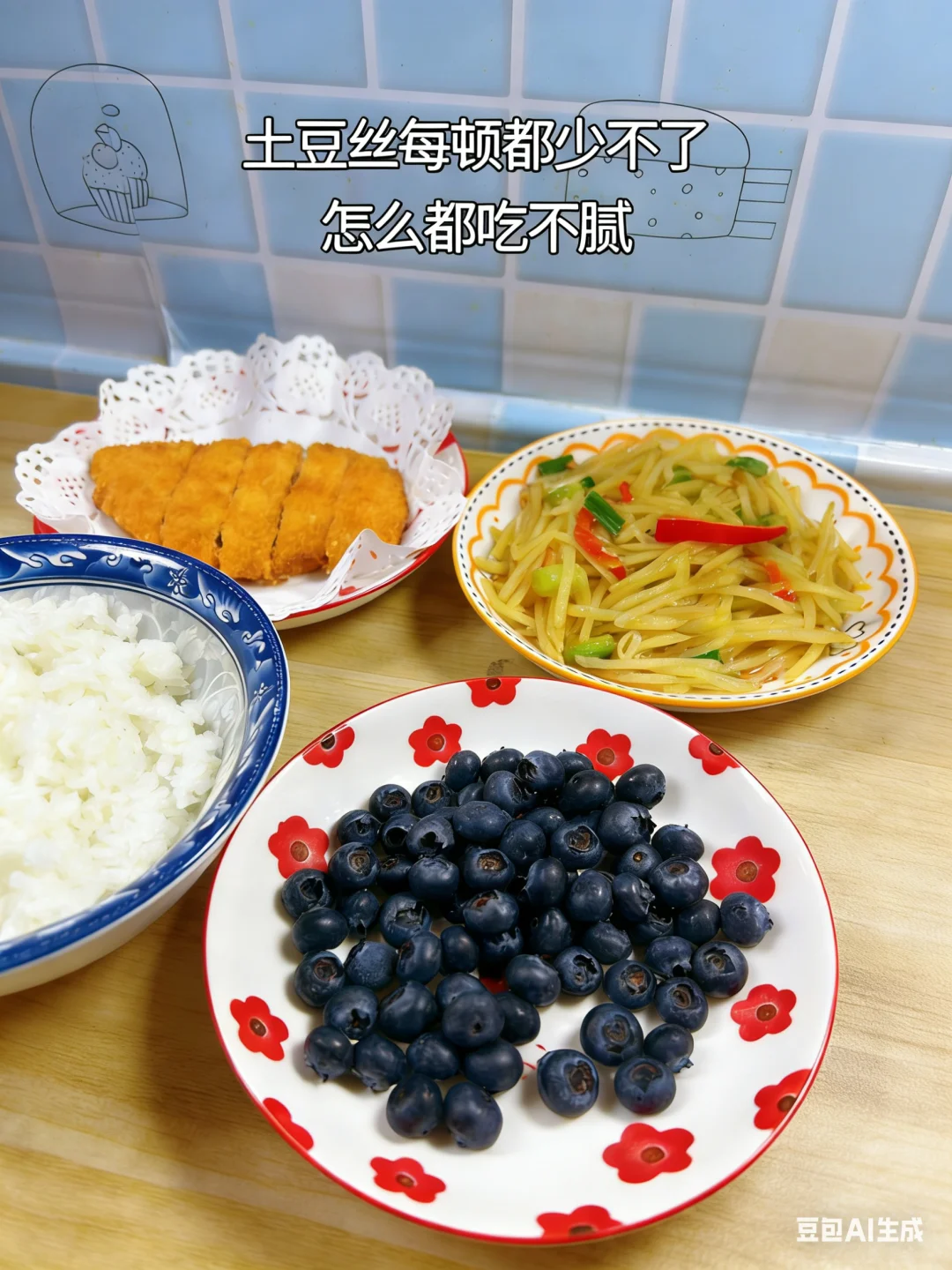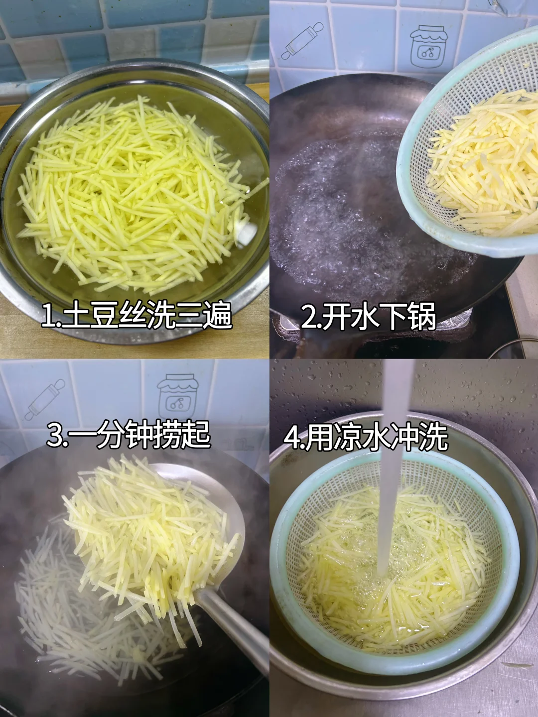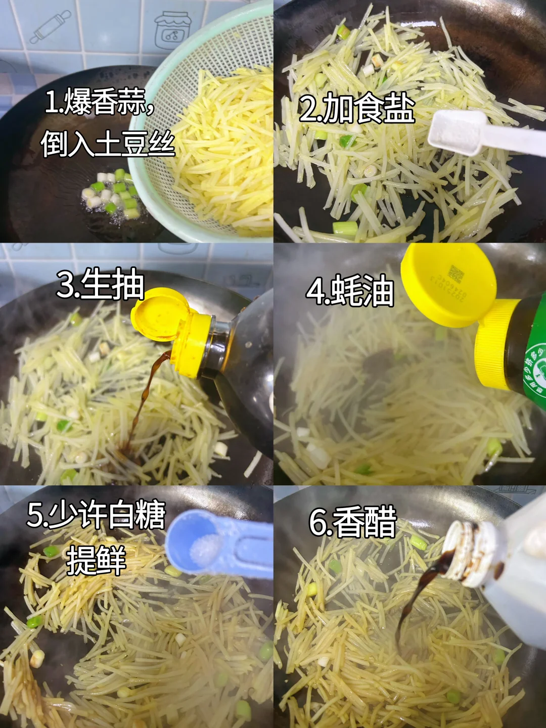 食材:土豆、大蒜苗(可选配胡萝卜丝、青红椒丝、蒜瓣、小葱等,喜欢吃辣的加干辣椒和花椒) 步骤: 1.土豆去皮,切丝,用水冲洗三遍,洗掉淀粉,炒的时候不粘腻,清脆爽口。 2.锅里烧开水,把土豆丝放下去焯水一分钟,捞起来过凉水。这样确保土豆丝均匀受热,断生而不烂,对新手来说很重要。 3.油热放入蒜苗的白色部分,爆香倒入沥干水的土豆丝,加入食盐、生抽、蚝油、白糖、香醋。 4.翻炒两分钟,加蒜苗叶出锅。 大人小孩百吃不厌的土豆丝,有它多干两碗饭,咸香适口带点酸,一盘土豆丝带来三餐的幸福感。