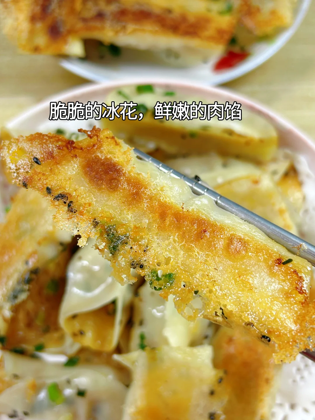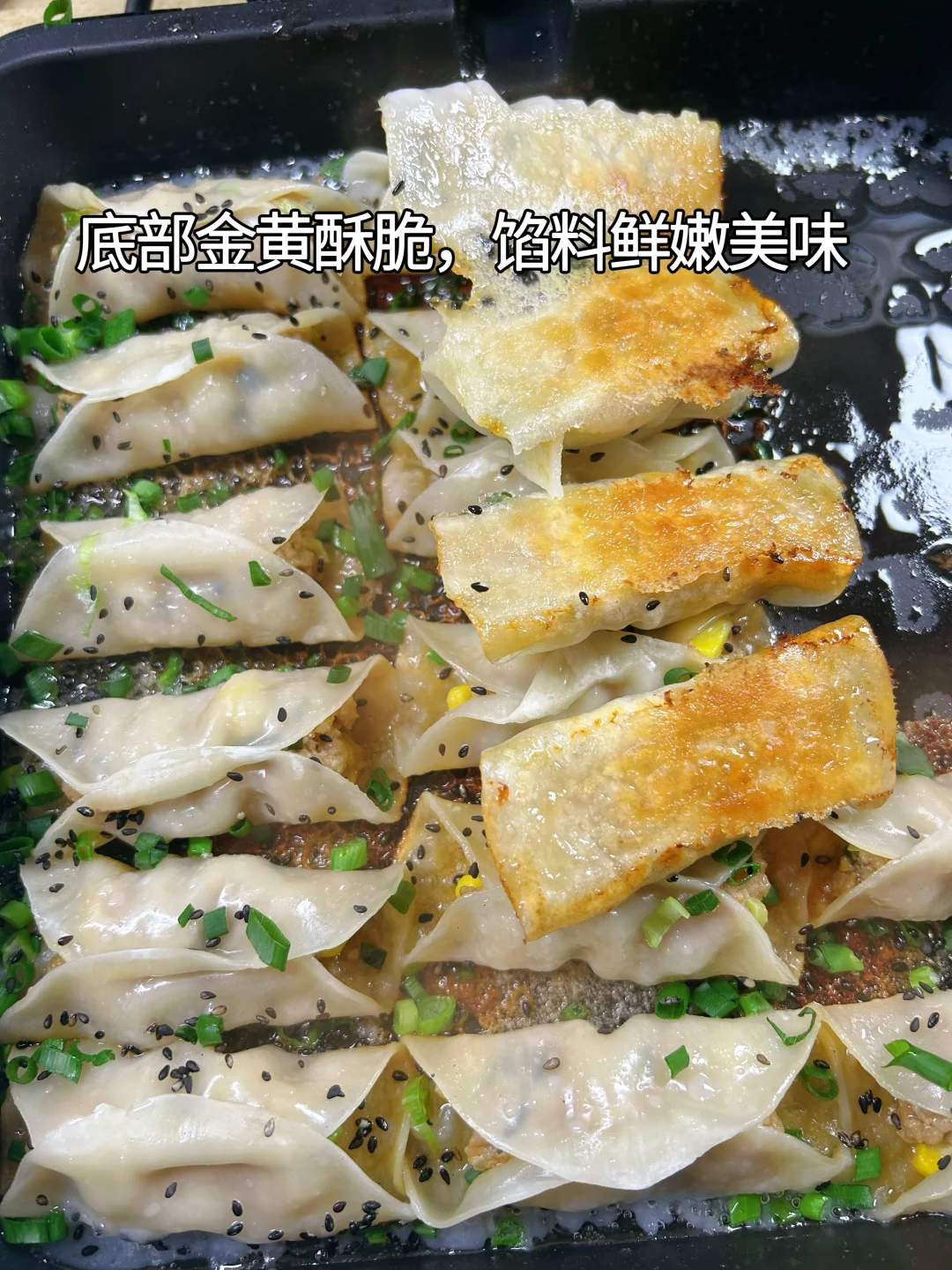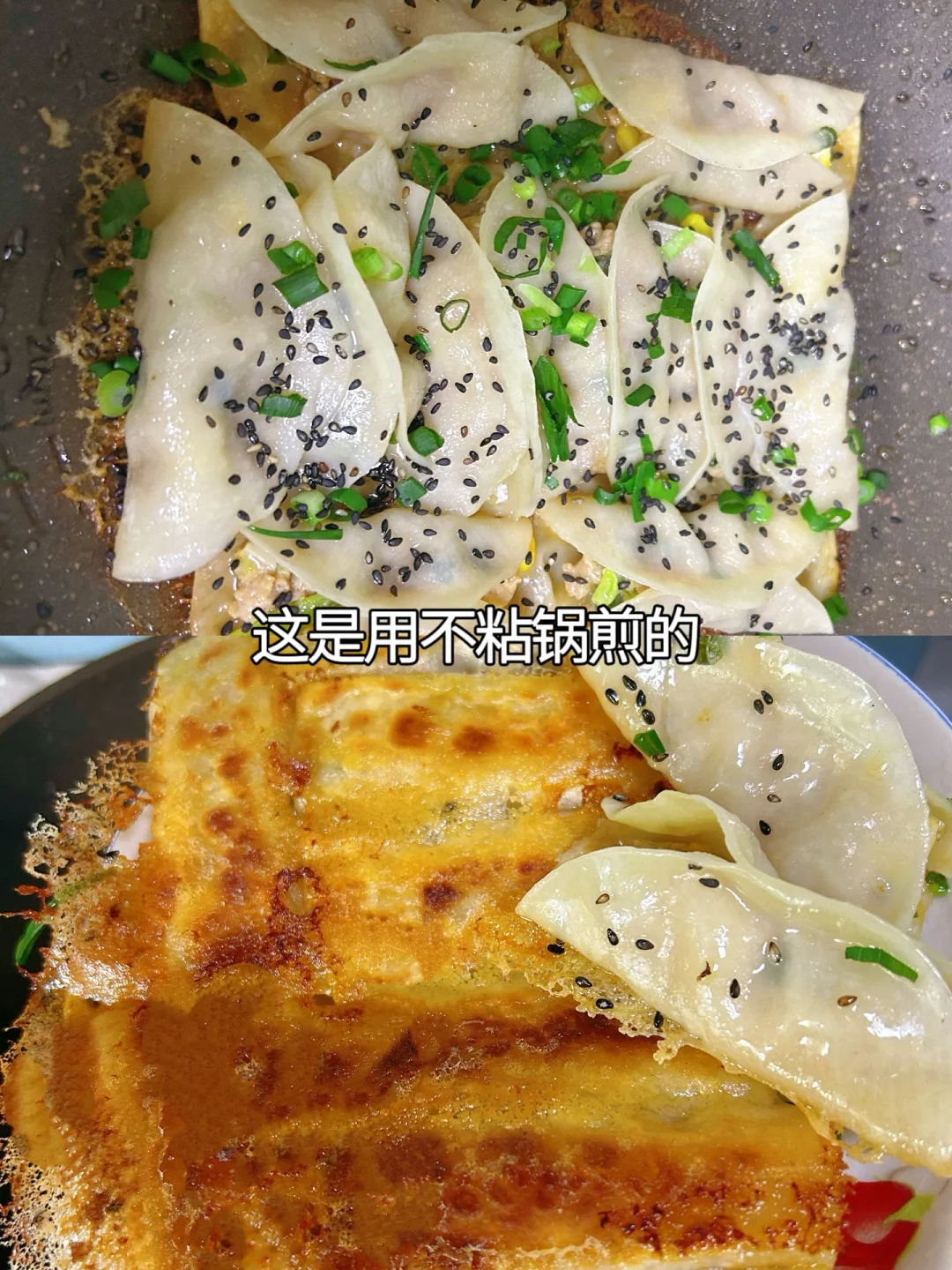 8.用电饼铛或平底锅都可以煎,掌握好火候,就能得到底部金黄酥脆,冰花满满,内里鲜嫩好吃的锅贴。